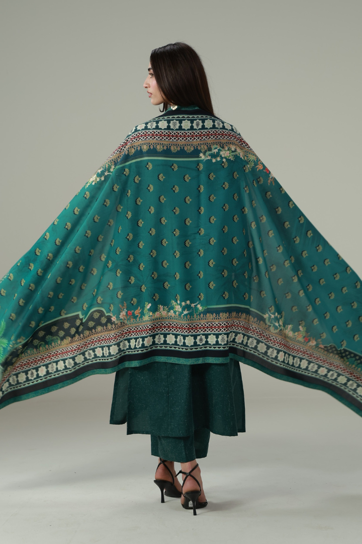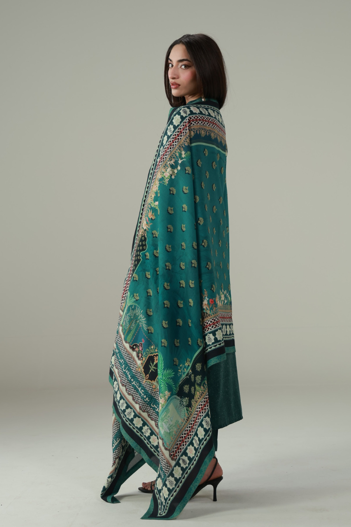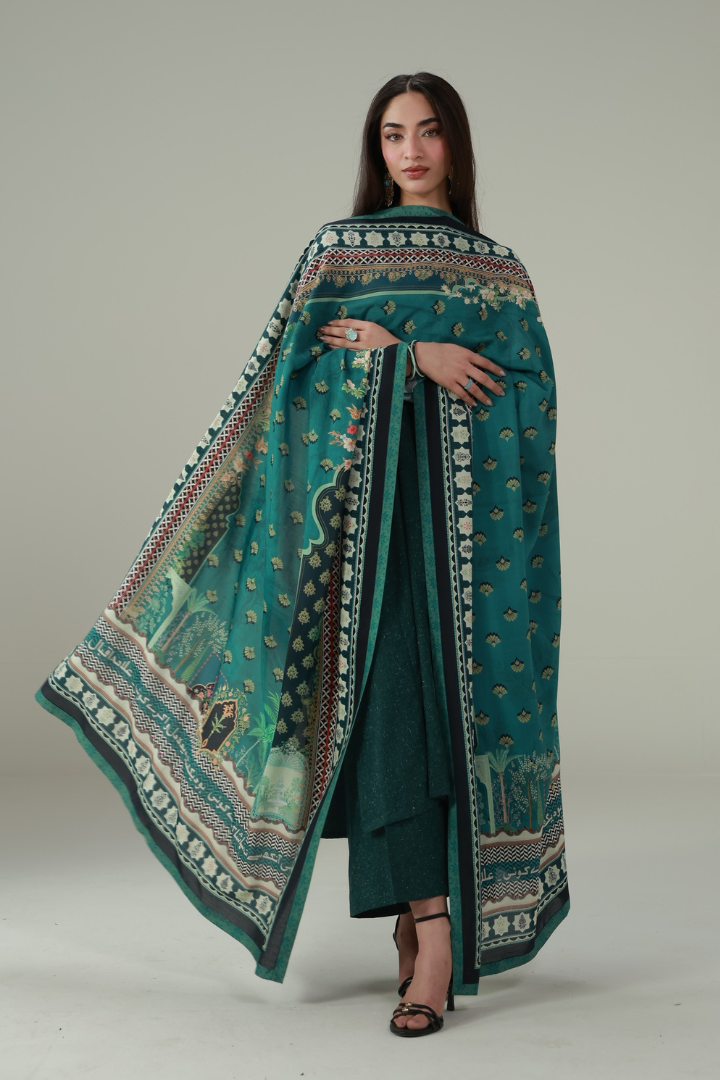 Nain Odhni, made from Cotton Silk, is a printed odhni featuring the words of Allama Iqbal calligraphed throughout.