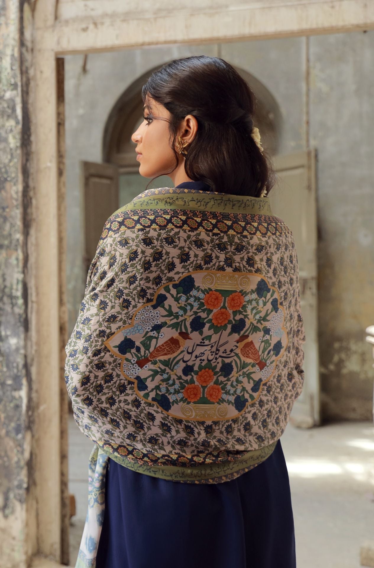 Luxurious Printed Crinkle Silk, is an ode to Jaleel Manikpuri. Featuring tassels on the sides & words such as Gul, Gulaab, Khushboo etc.