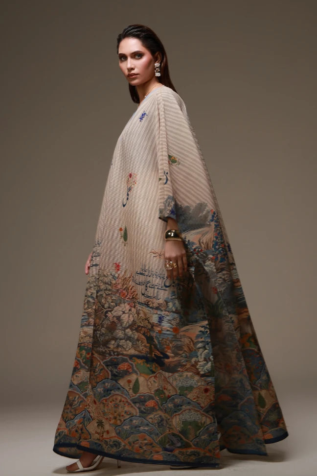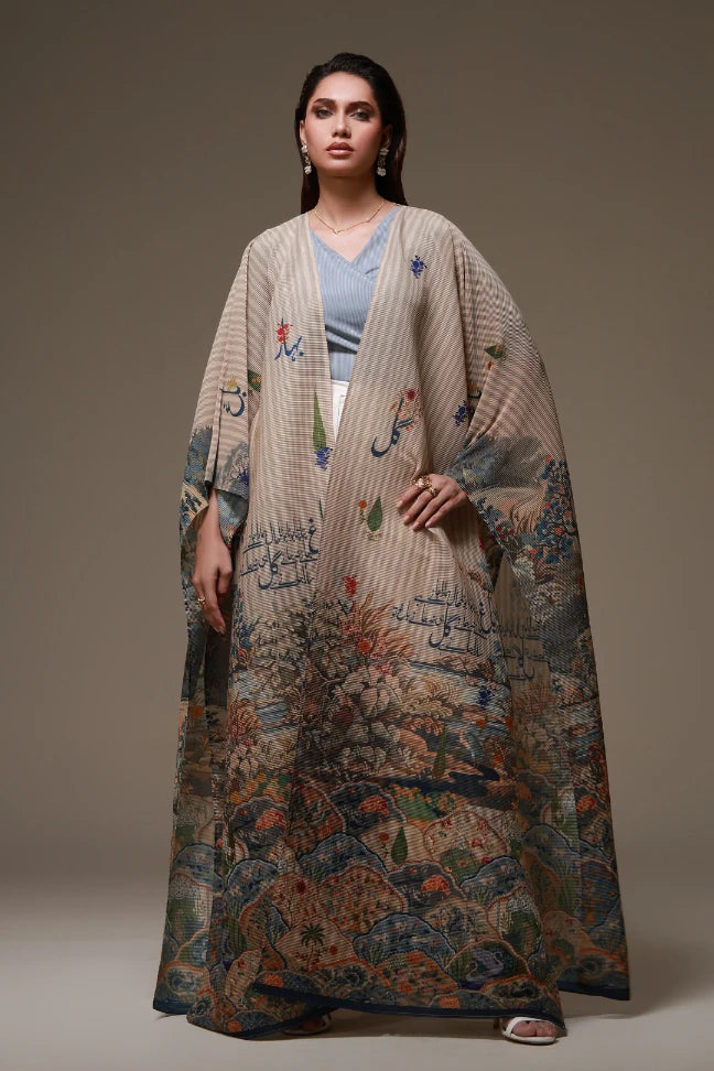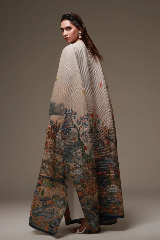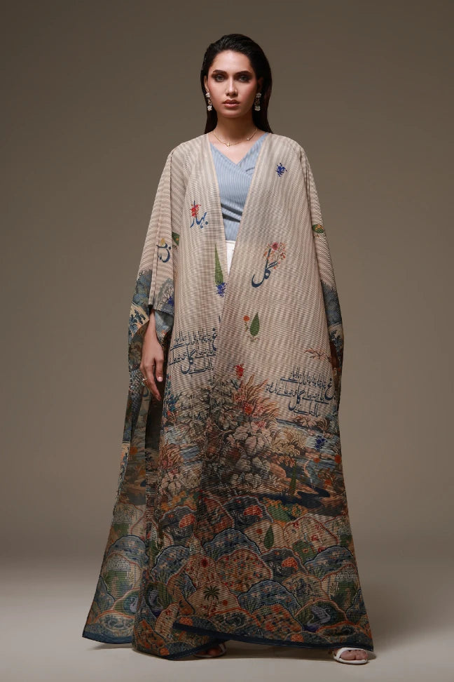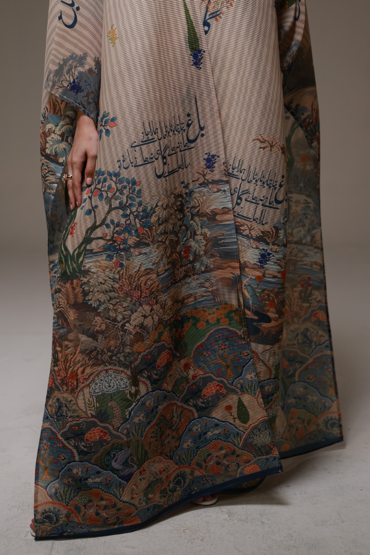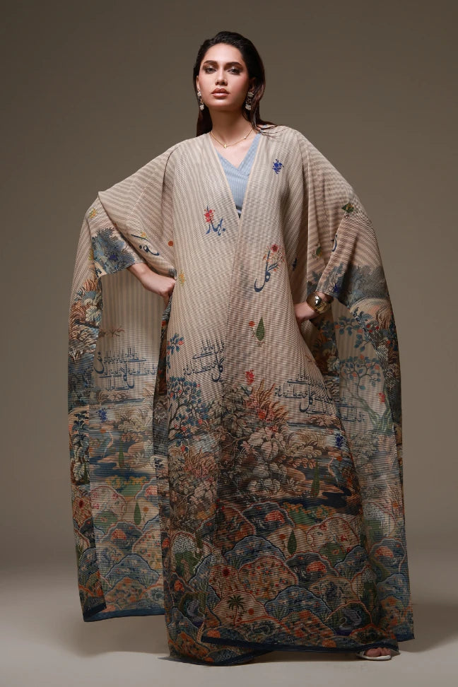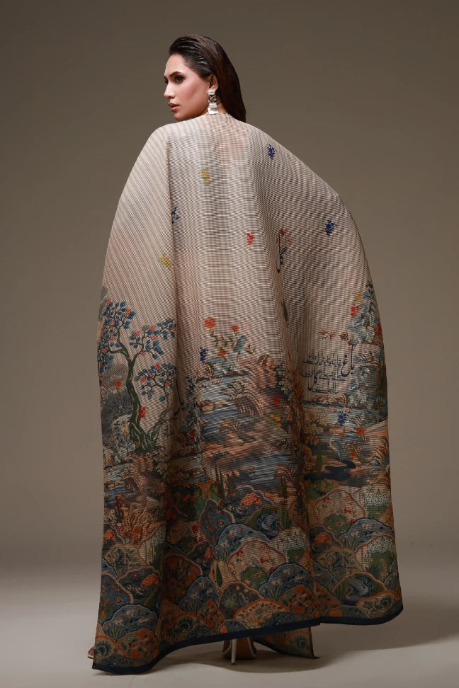 Bagh-e-Ulfat Cape is made from crinkled fabric, designed to flow effortlessly carrying the words of Mir Taqi Mir. A versatile piece that adds softness, and meaning to any look.