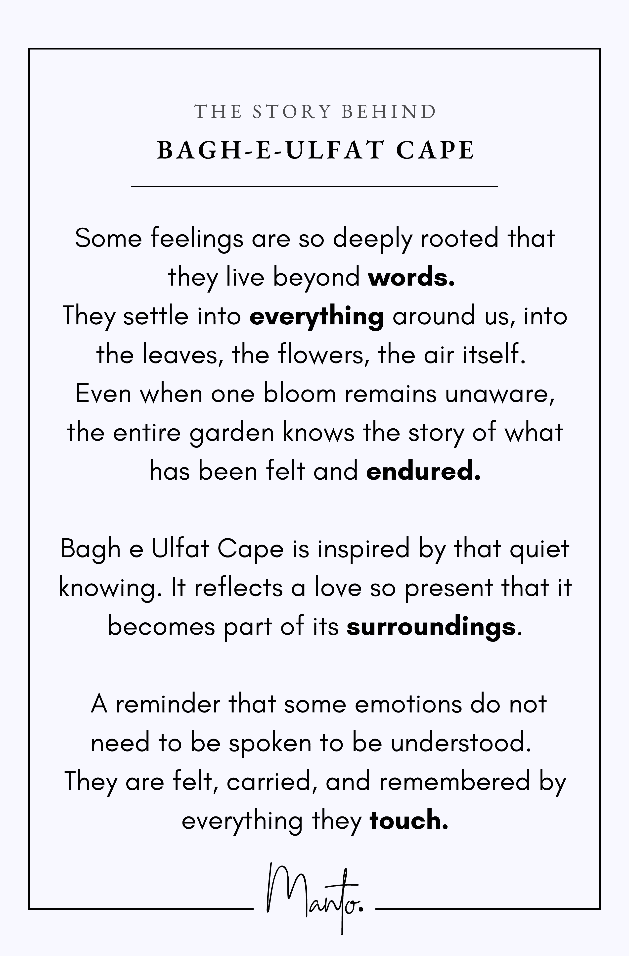 Bagh-e-Ulfat Cape is inspired by that quiet knowing. It reflects a love so present that it becomes part of its surroundings. A reminder that some emotions do not need to be spoken to be understood. They are felt, carried, and remembered by everything they touch.