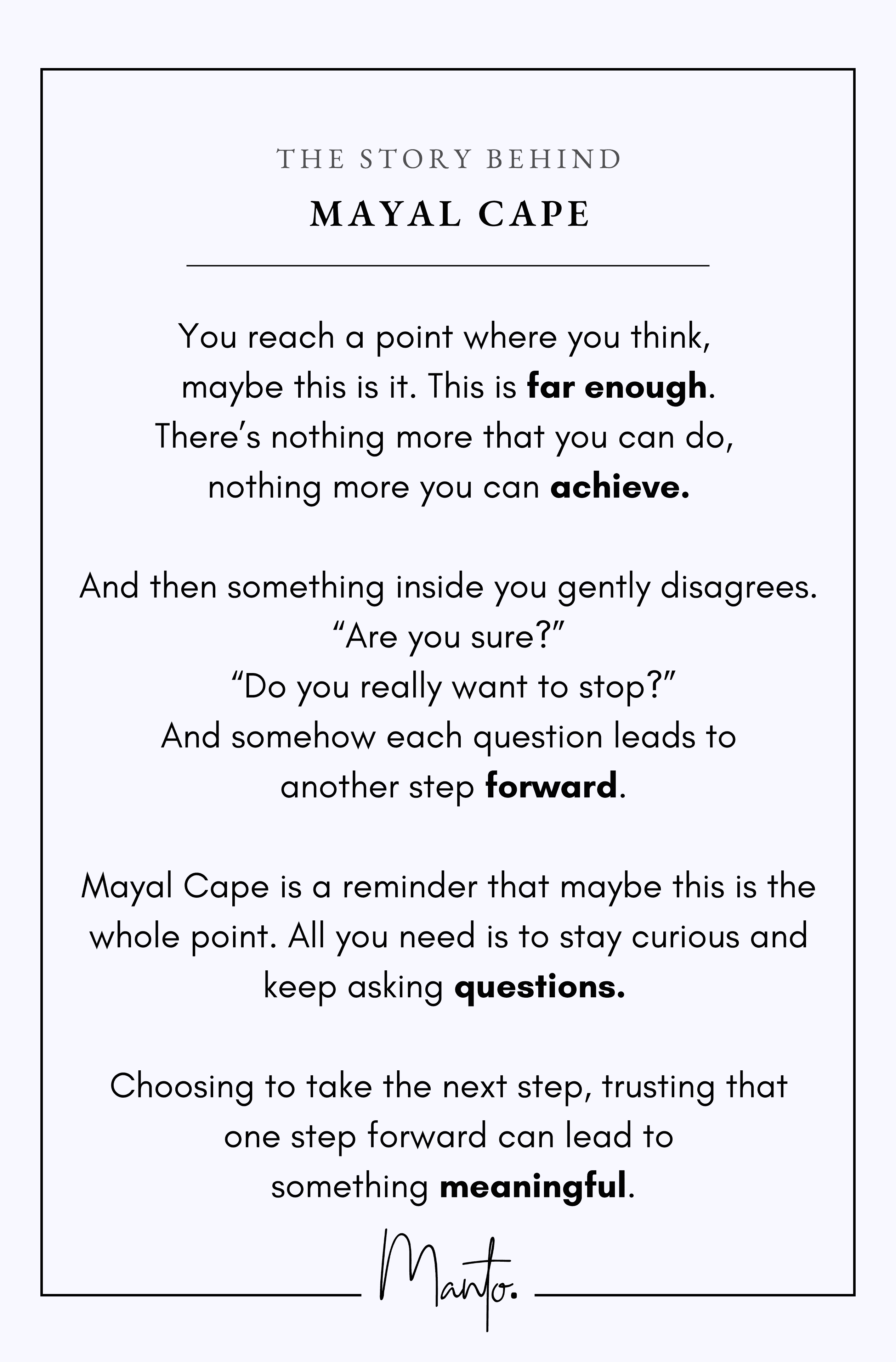 Mayal Cape is a reminder that maybe this is the whole point. All you need is to stay curious and keep asking questions. Choosing to take the next step, trusting that one step forward can lead to something meaningful.