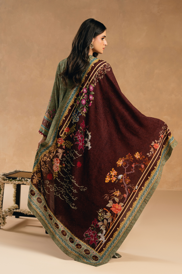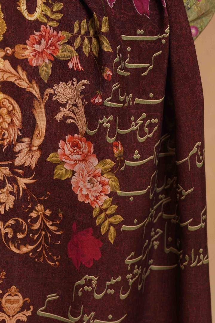 Aashna Odhni, made from Cotton Silk, is a printed odhni featuring the words of Hafeez Hoshiarpuri calligraphed throughout.