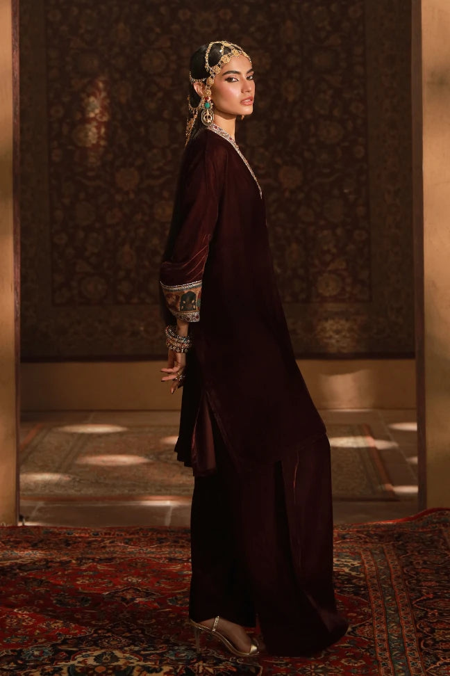 Shirin Set, is a premium 2-Piece Set with a boxy-cut velvet short shirt paired with farshi shalwar. With printed neckline, tassels and button detailing and boxy sleeves with printed cuffs.