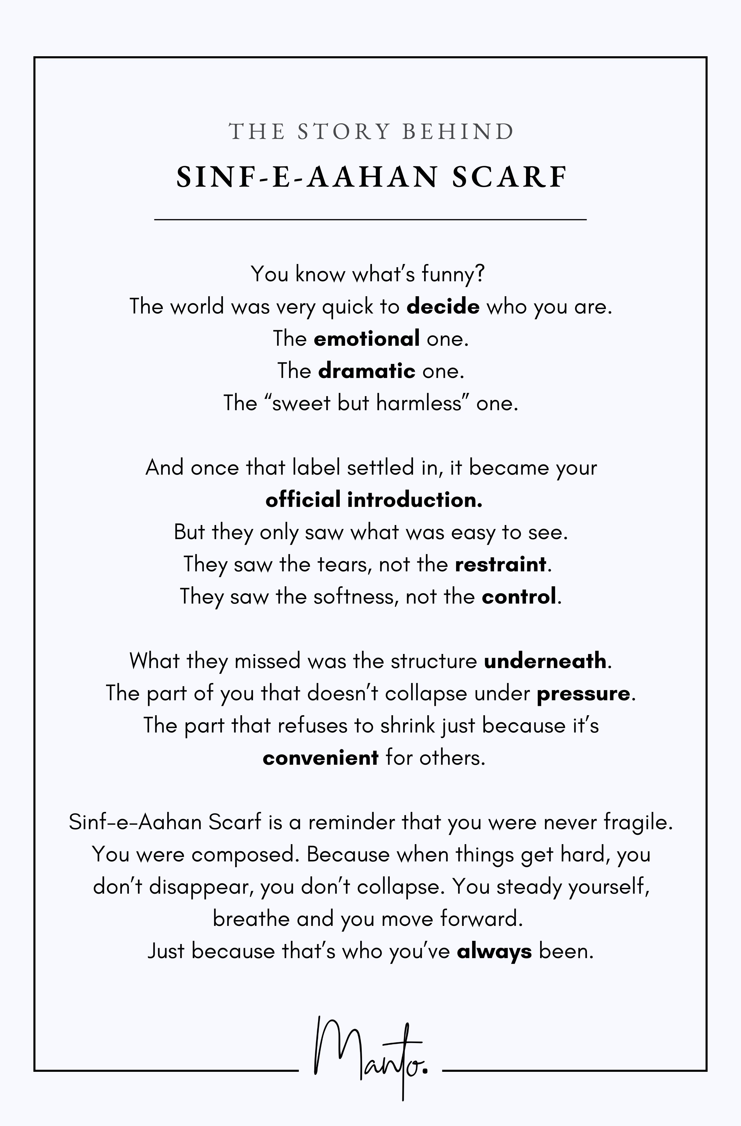 Sinf-e-Aahan Scarf is a reminder that you were never fragile. You were composed. Because when things get hard, you don’t disappear, you don’t collapse. You steady yourself, breathe and you move forward. Just because that’s who you’ve always been.