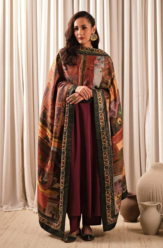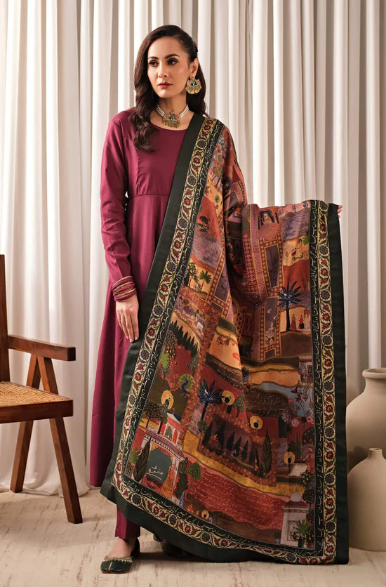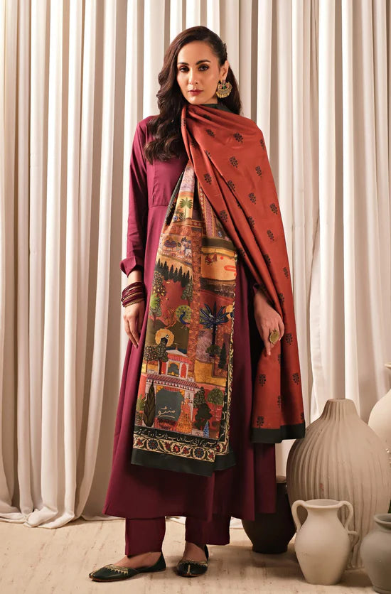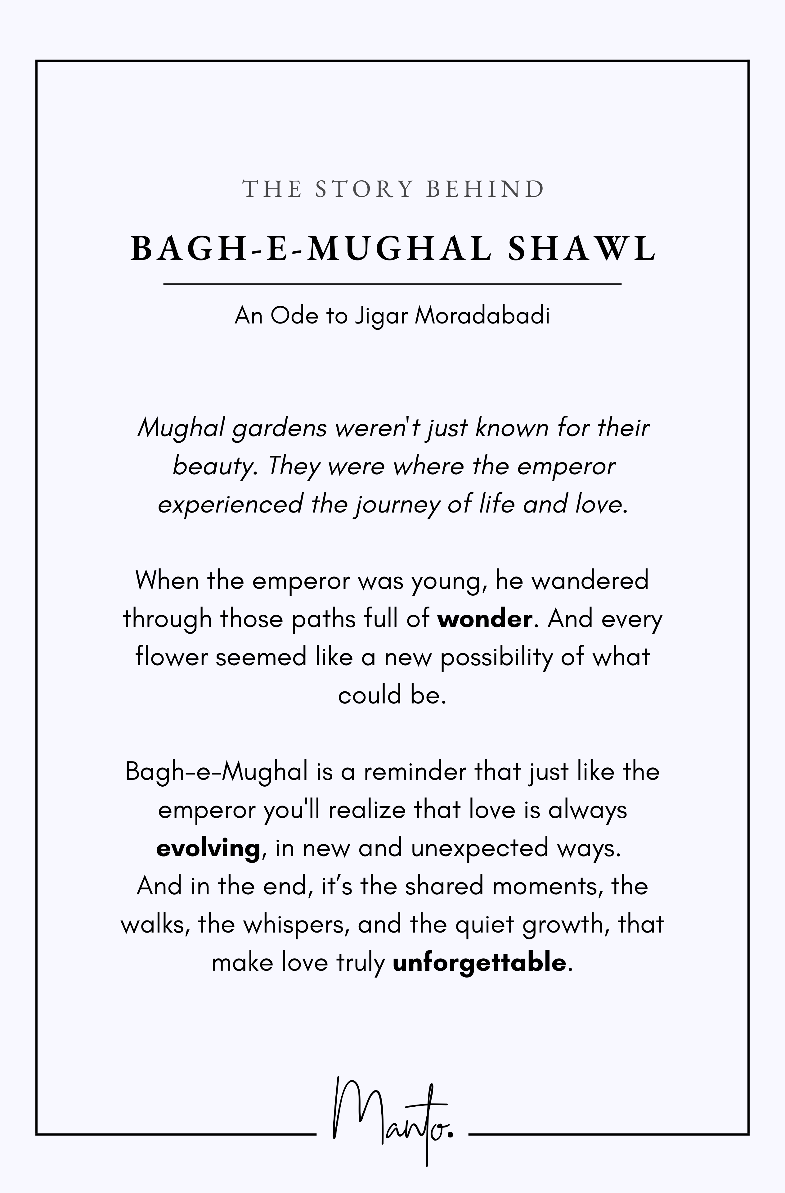The Bagh-e-Mughal Shawl is made from Herringbone. This double sided shawl features the word “bagh-e-mughal” and has the words of Jigar Moradabadi on the borders.