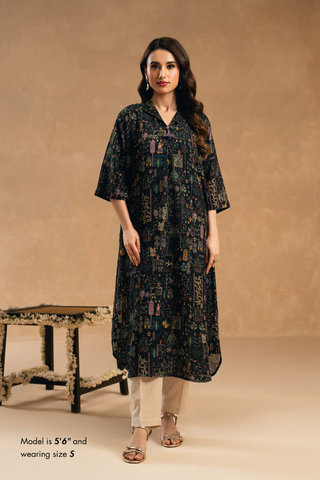 - Collared neckline with a front placket