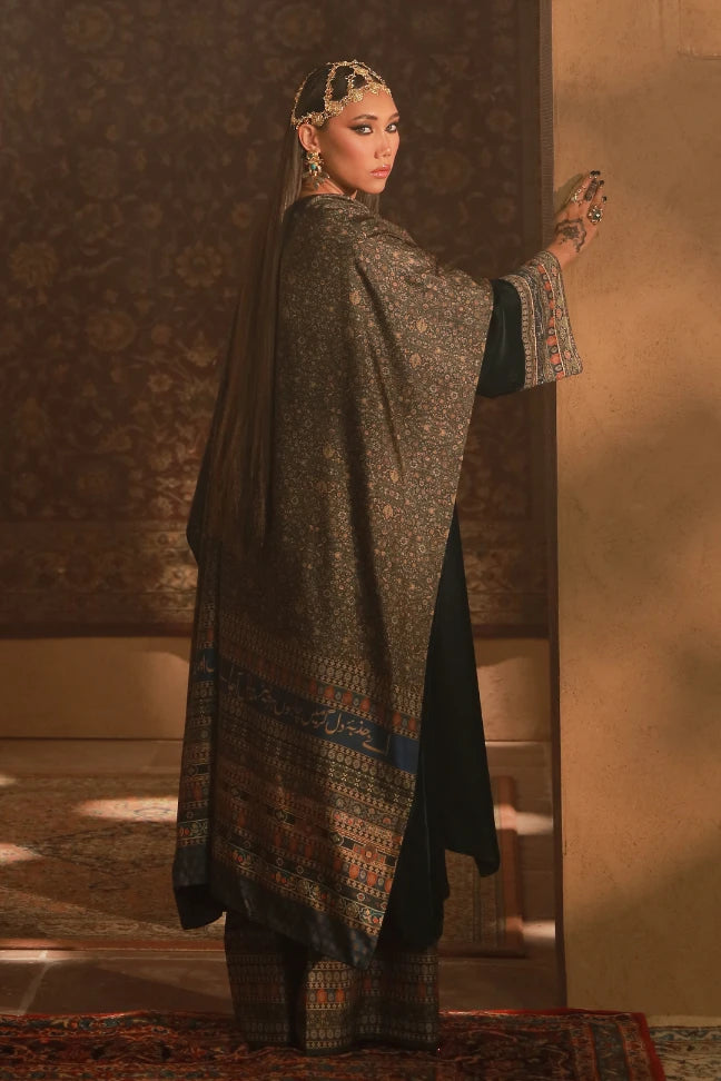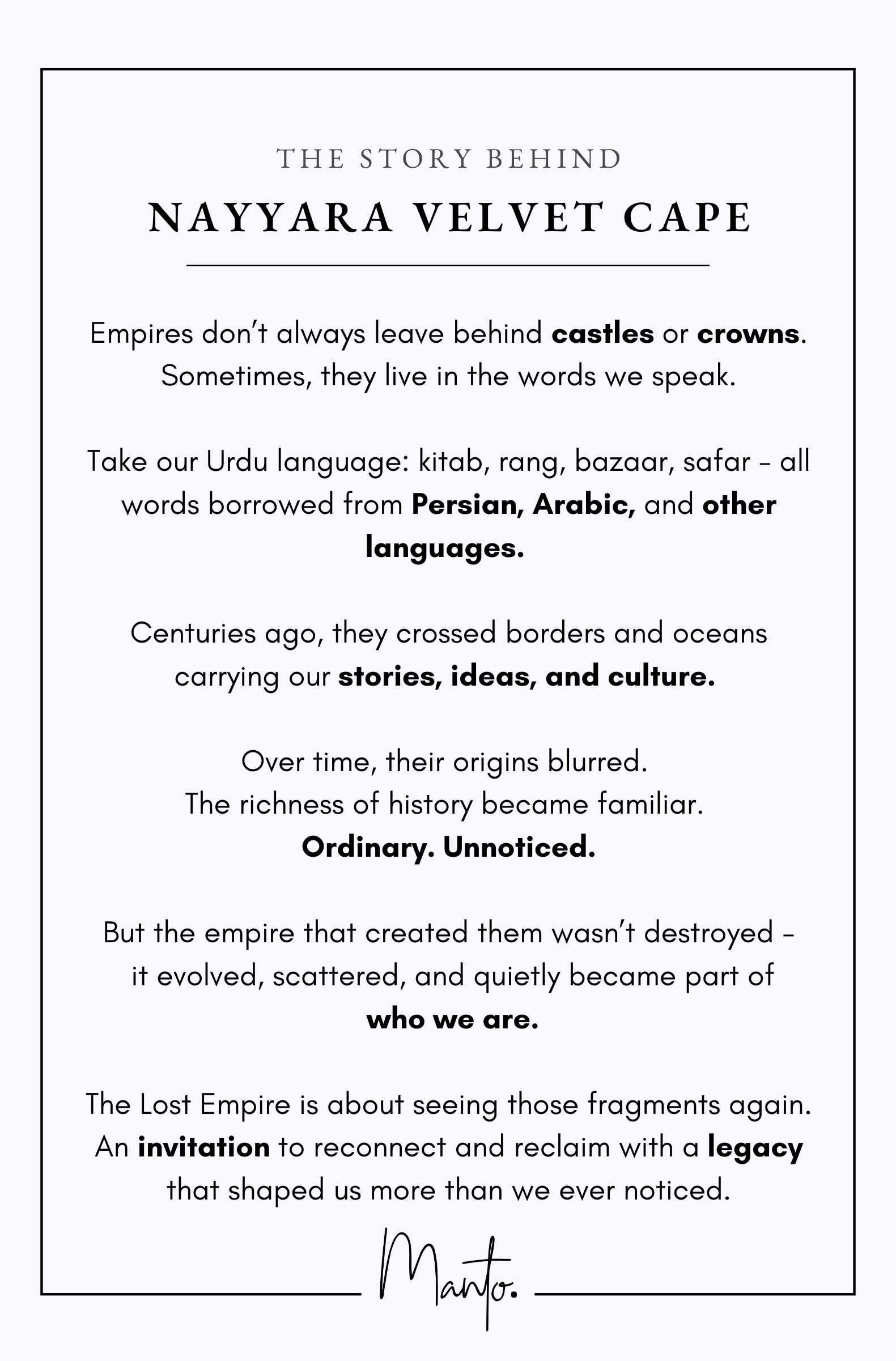Nayyara Cape, is a reversible cape! Made with premium Velvet, the back of this cape features a printed Raw Silk design. Allowing you to wear it either way and make a statement! This Cape features the words of Behzad Lucknavi.