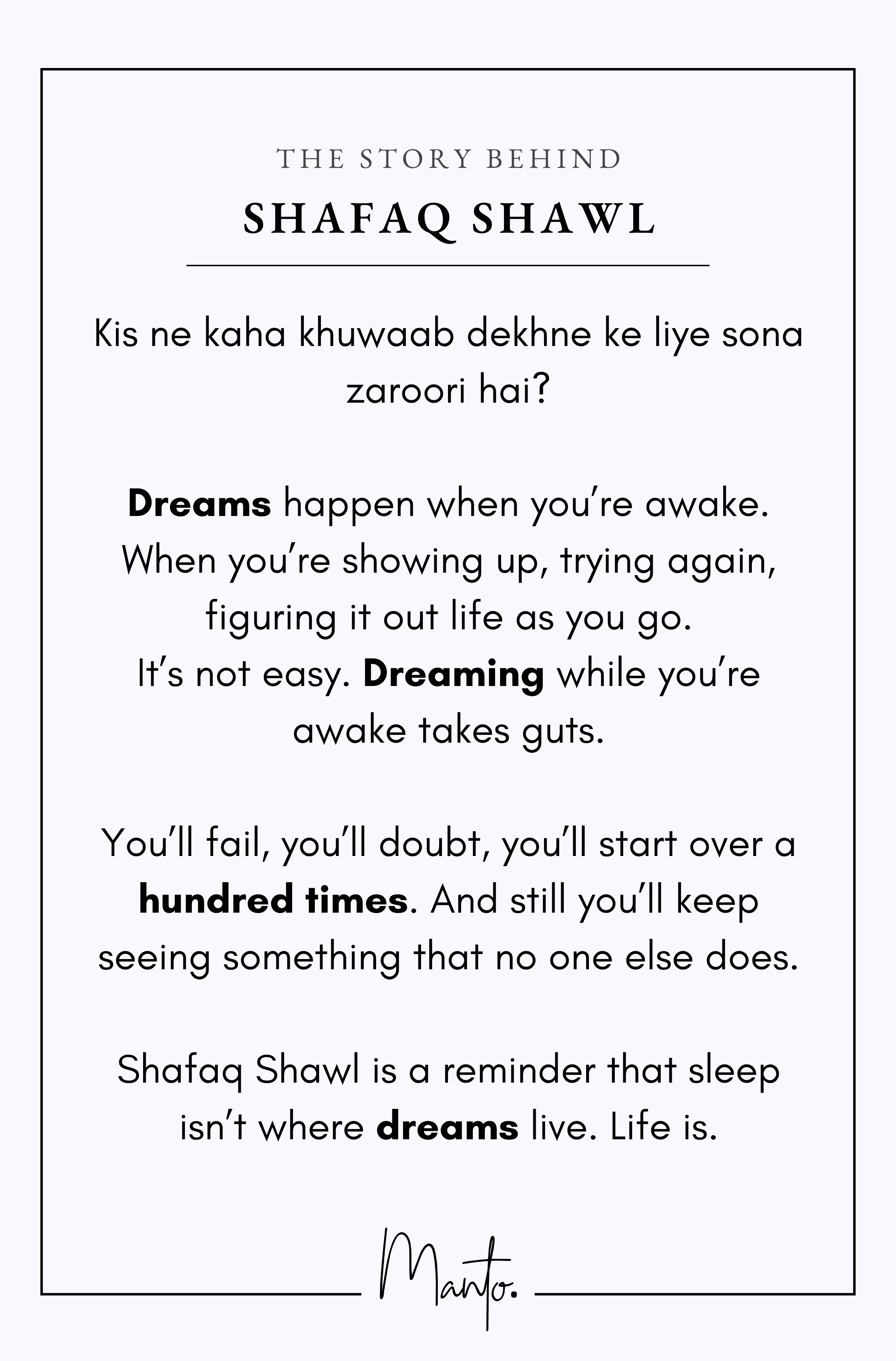 Shafaq Shawl is a reminder that sleep isn’t where dreams live. Life is.