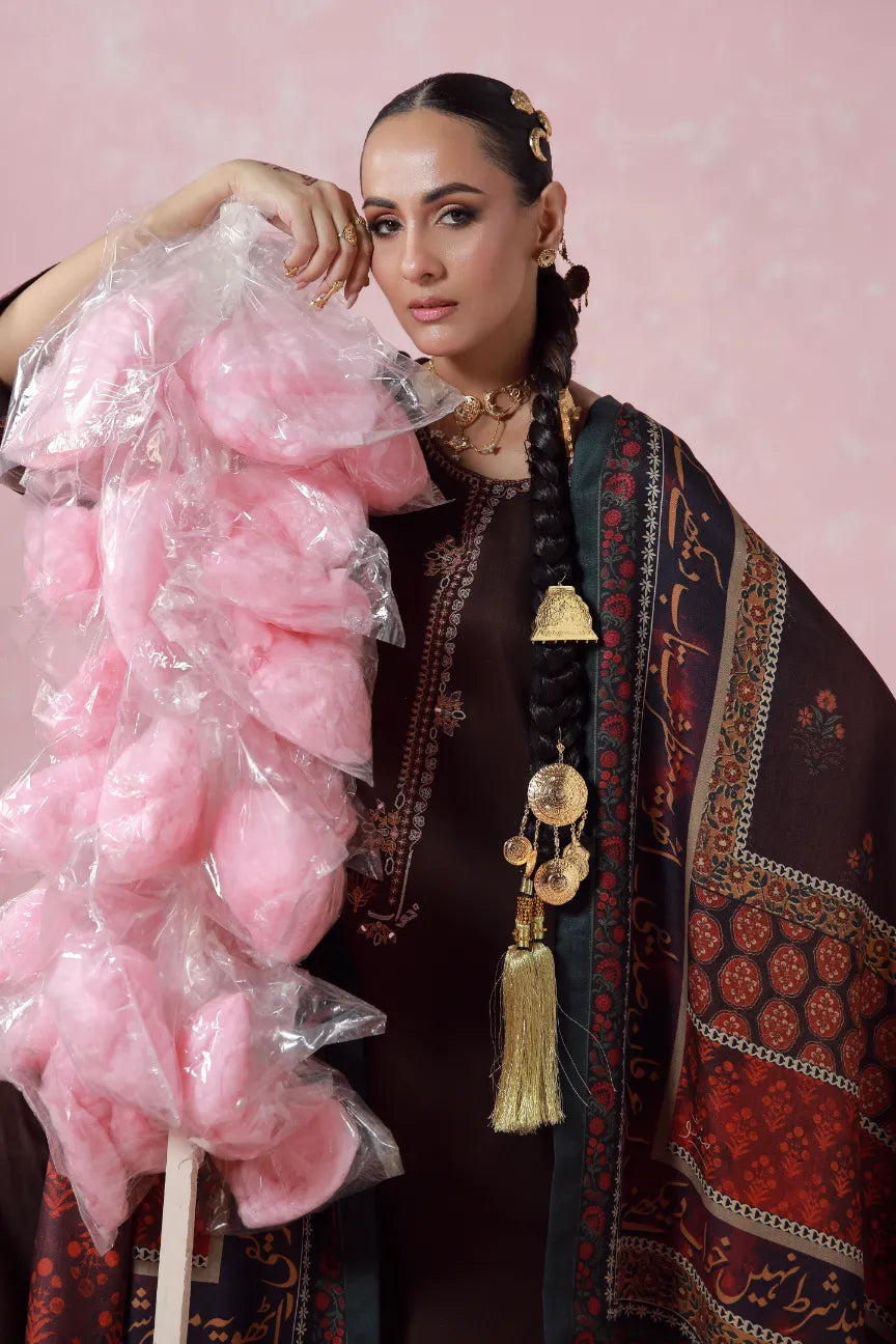 The Umber Co-Ord Set is a 2-piece set made using herringbone. Featuring a long-length shirt paired with an ijaar. This Co-Ord Set features the Urdu word khuwab embroidered.