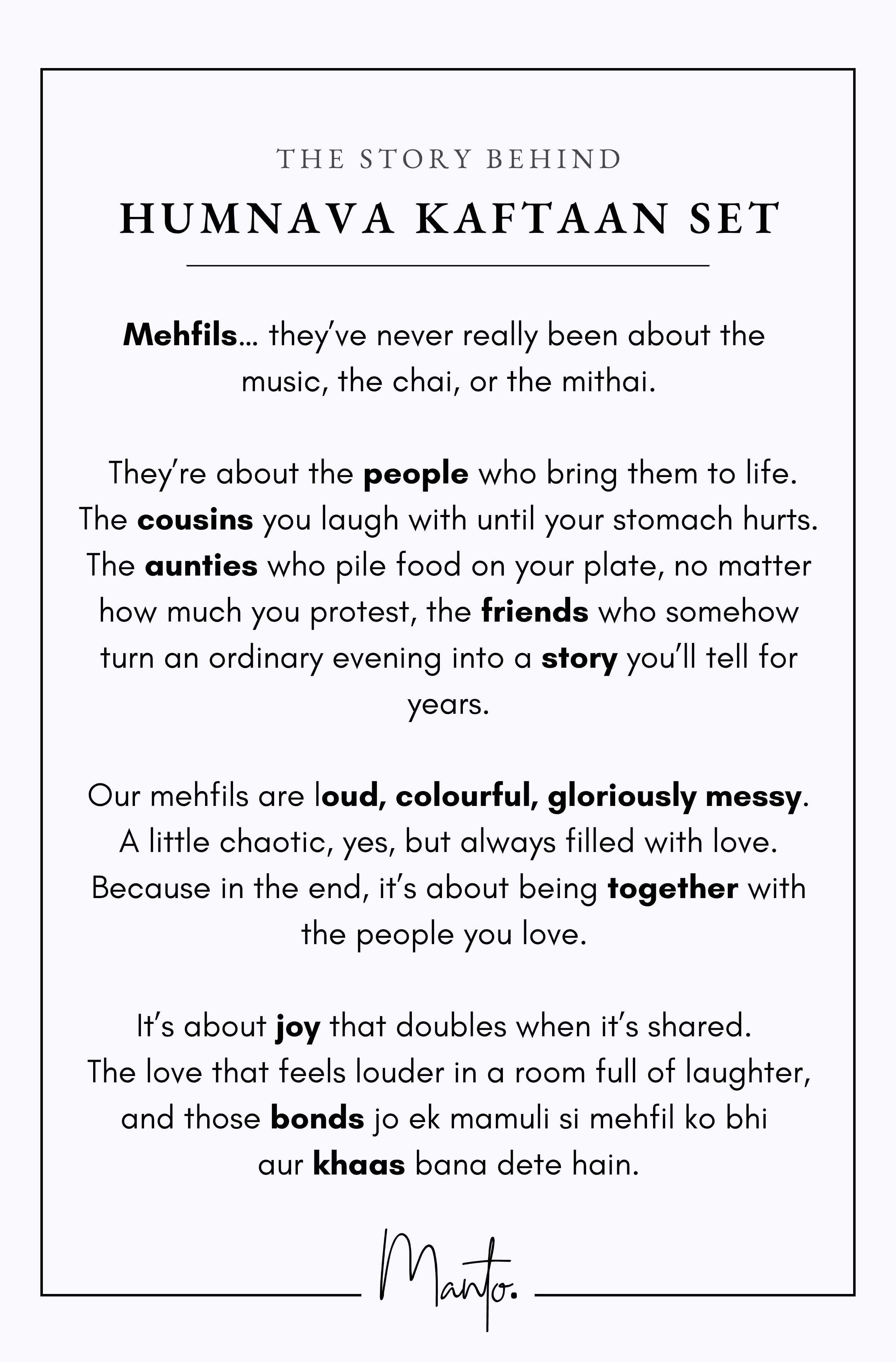 The Humnava Kaftaan Set is crafted from premium raw silk and paired with straight pants. Featuring Sequin Embroidery on the Neckline.
