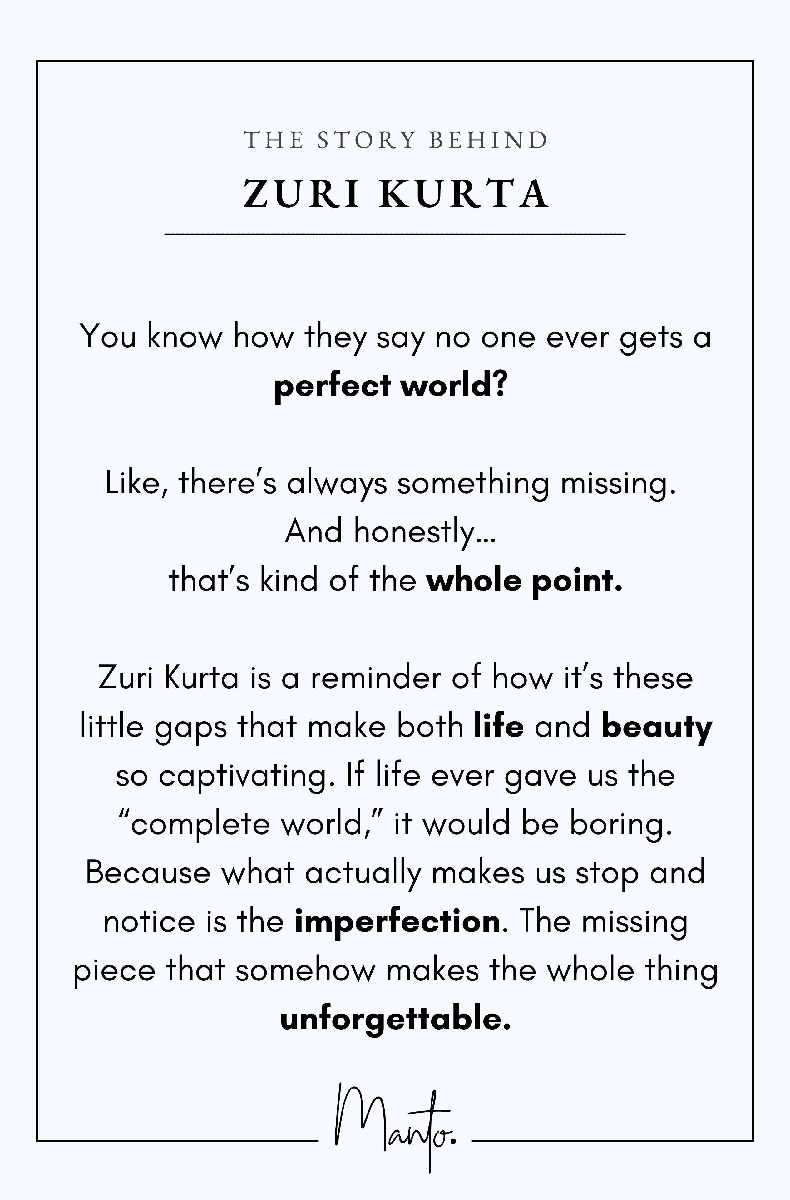 Zuri Kurta is a reminder of how it’s these little gaps that make both life and beauty so captivating. If life ever gave us the “complete world,” it would be boring. Because what actually makes us stop and notice is the imperfection. The missing piece that somehow makes the whole thing unforgettable.