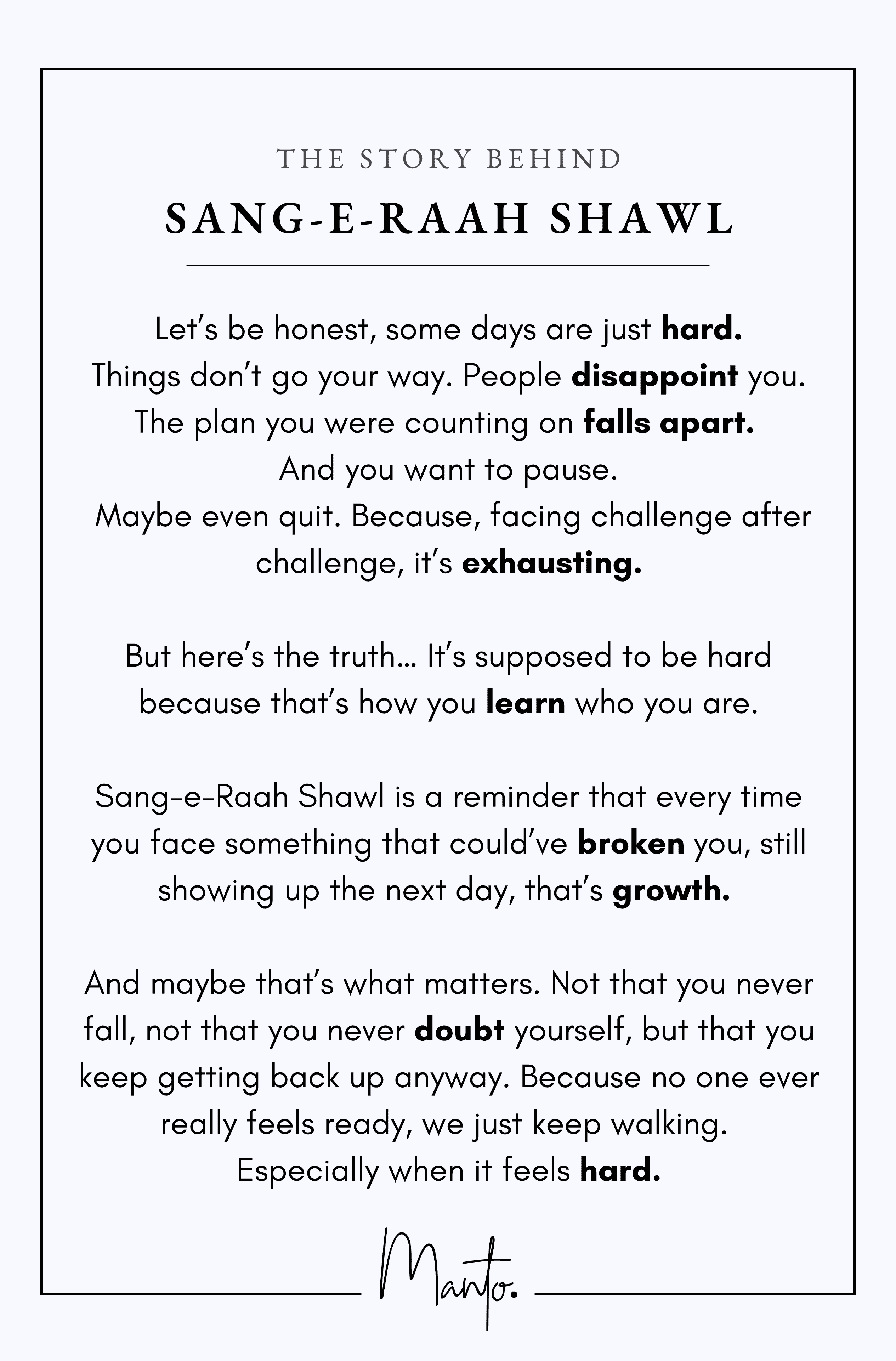 Sang-e-Raah Shawl is a reminder that every time you face something that could’ve broken you, still showing up the next day, that’s growth.
