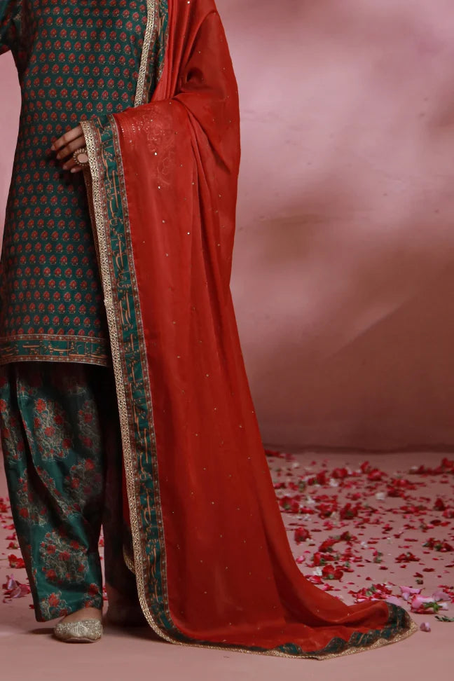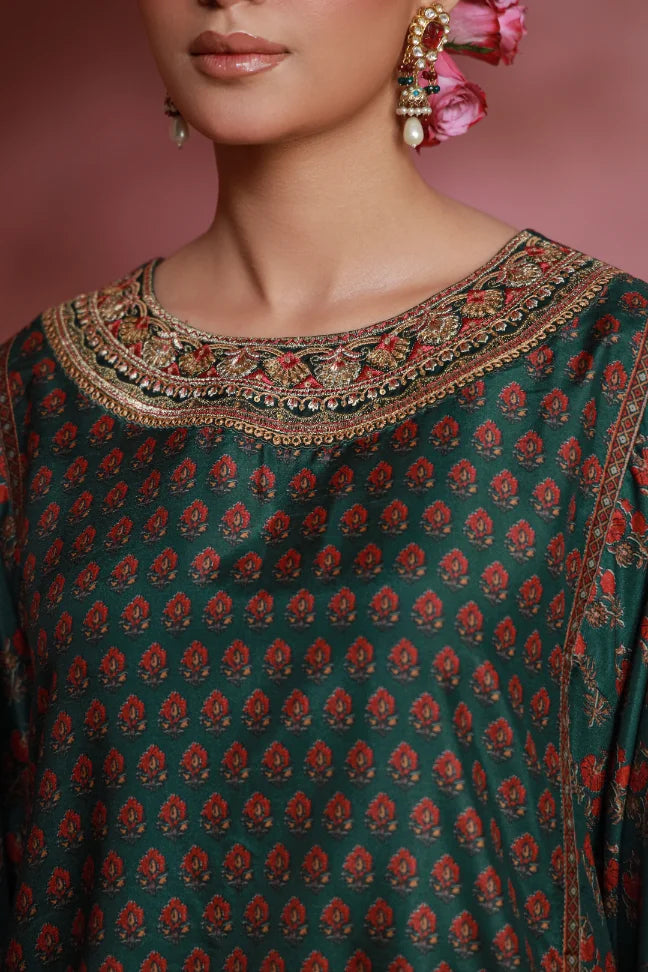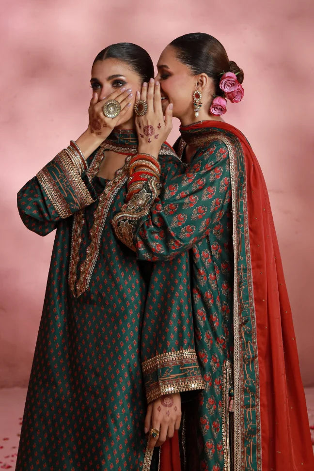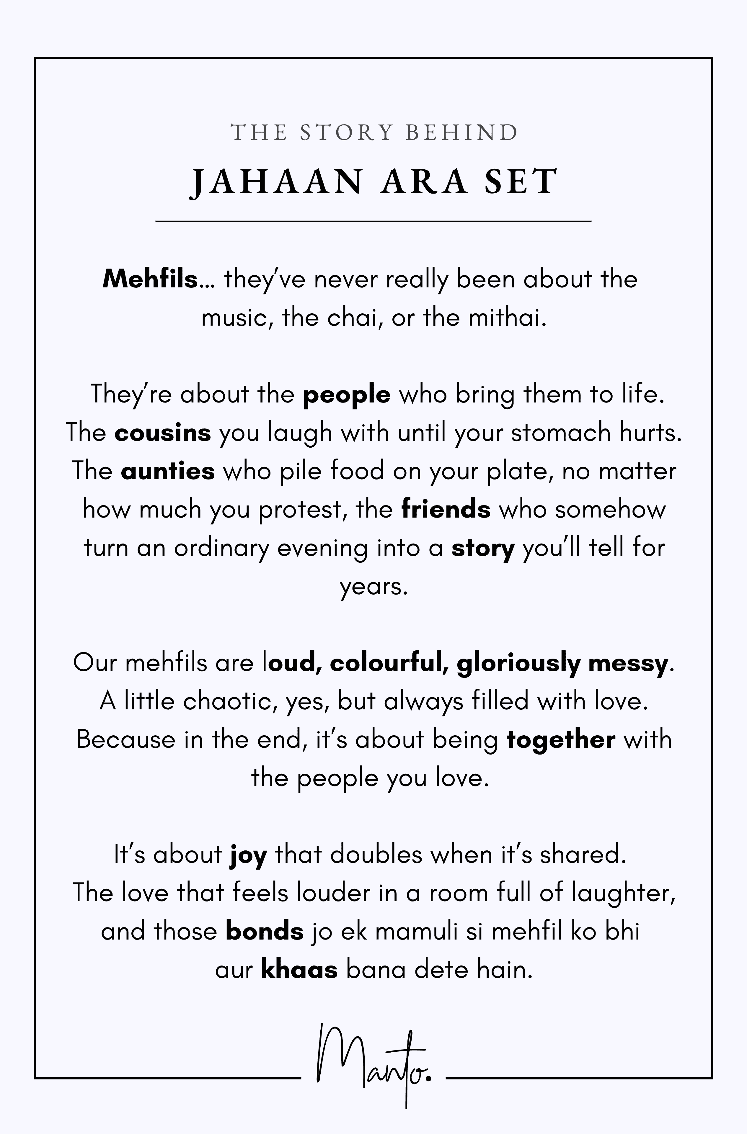 The Jahaan Aara 3-Piece Set is crafted from premium raw silk, paired with shalwar, & dyed silk dupatta. Featuring the timeless words of Sahir Ludhianvi.