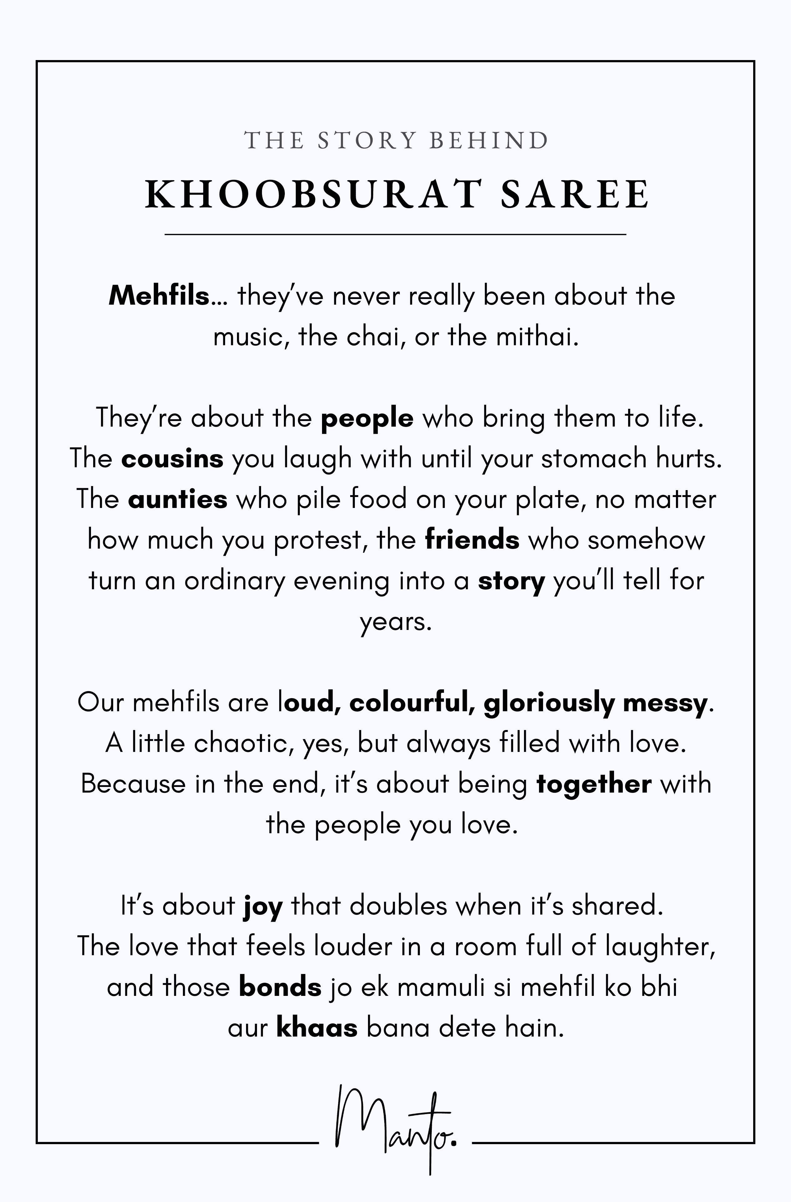 It’s about joy that doubles when it’s shared. The love that feels louder in a room full of laughter, and those bonds jo ek mamuli si mehfil ko bhi aur khaas bana dete hain.
