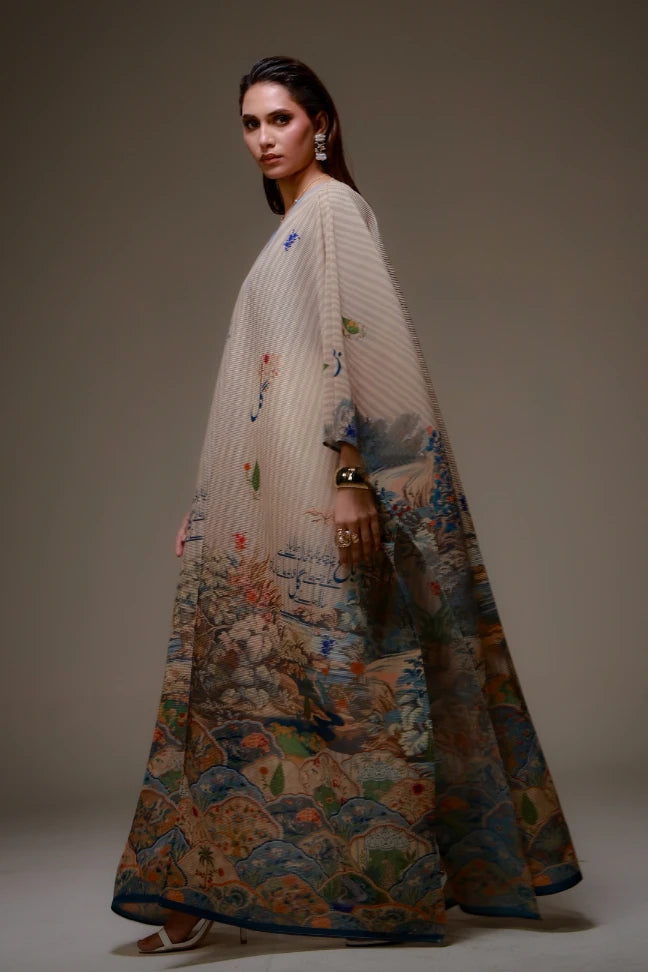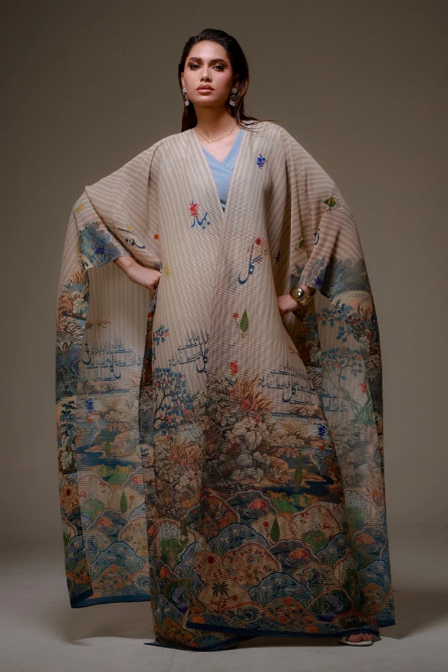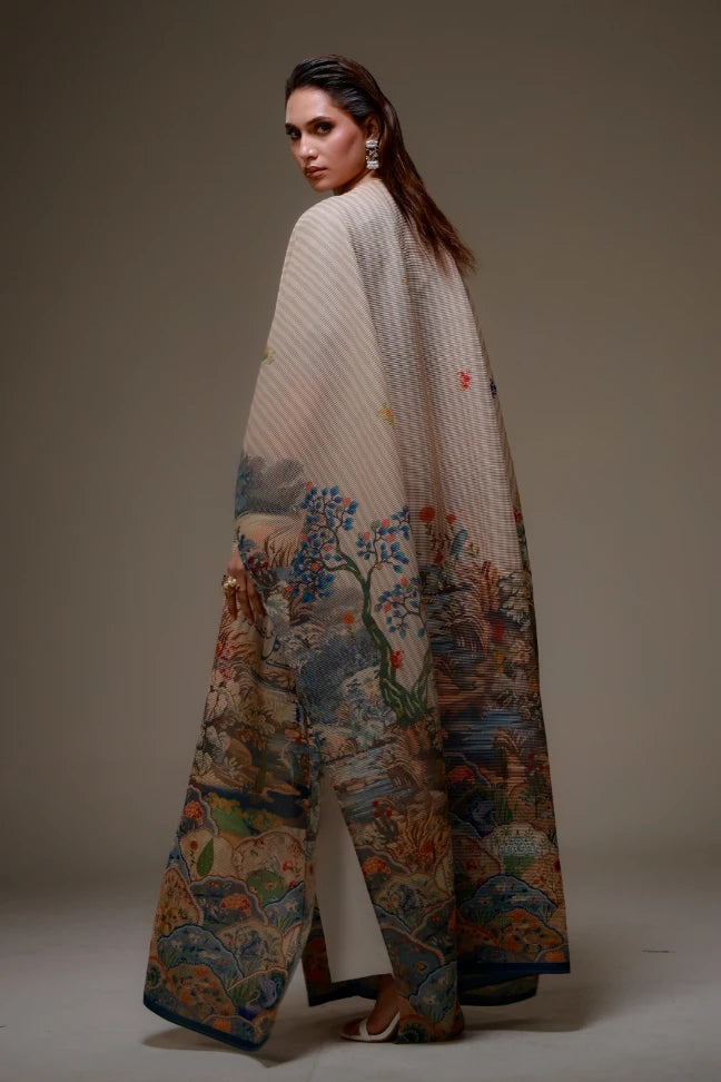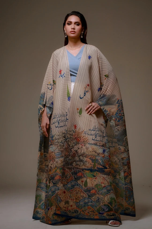 Bagh-e-Ulfat Cape is made from crinkled fabric, designed to flow effortlessly carrying the words of Mir Taqi Mir. A versatile piece that adds softness, and meaning to any look.