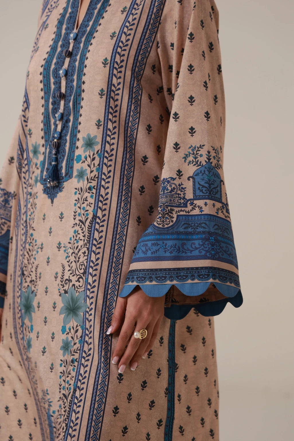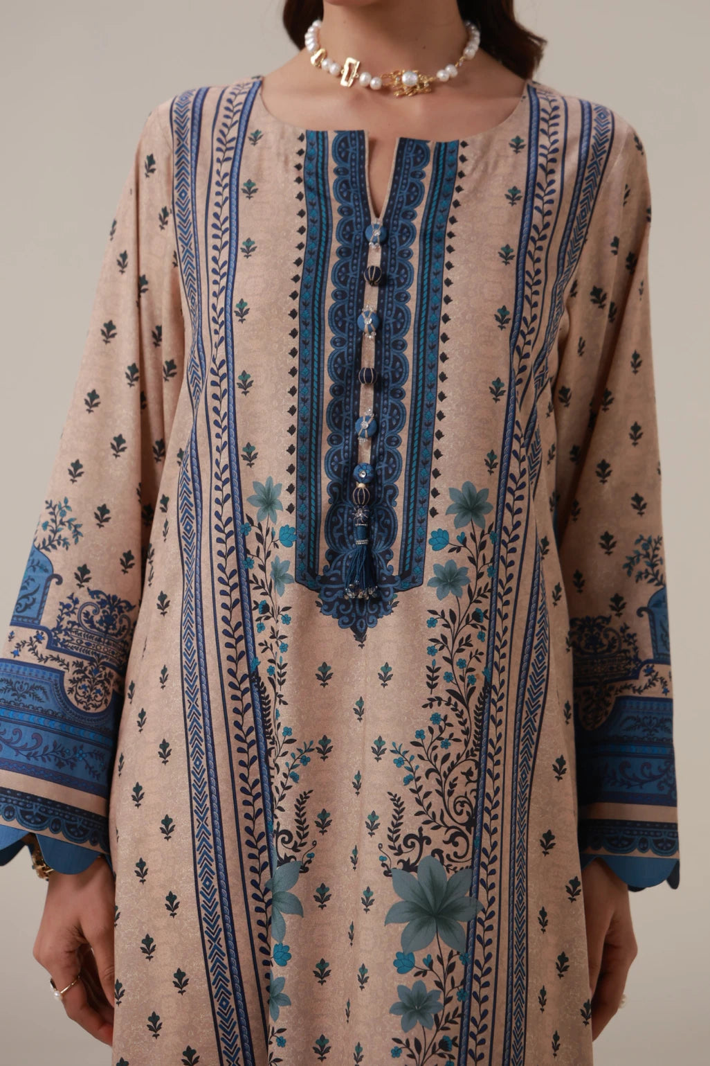 Buttons, tassels and embellishment on the neckline