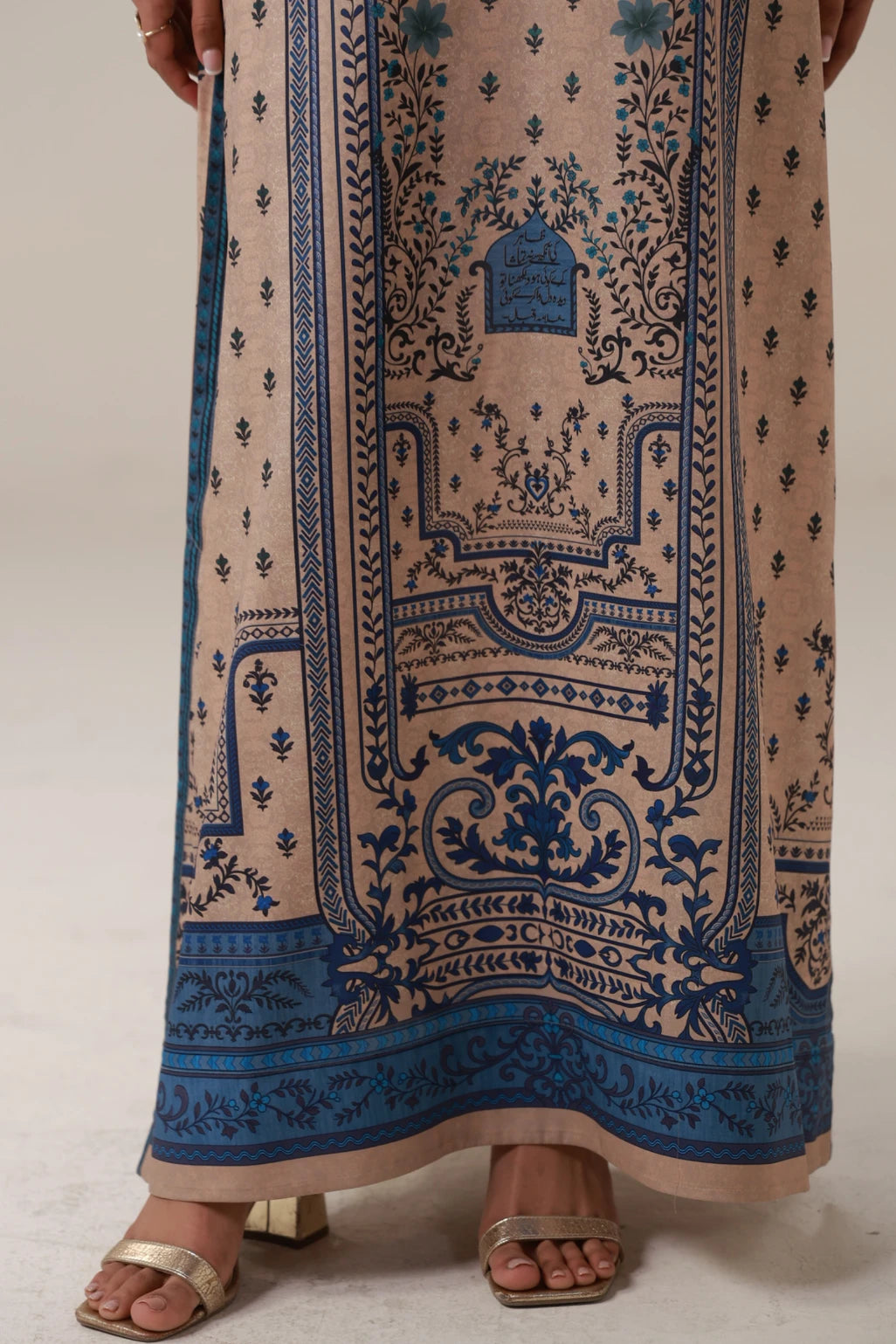 The Deedar Kaftaan is a printed kaftan with embellishments on the neckline and the words of Allama Iqbal calligraphed across.