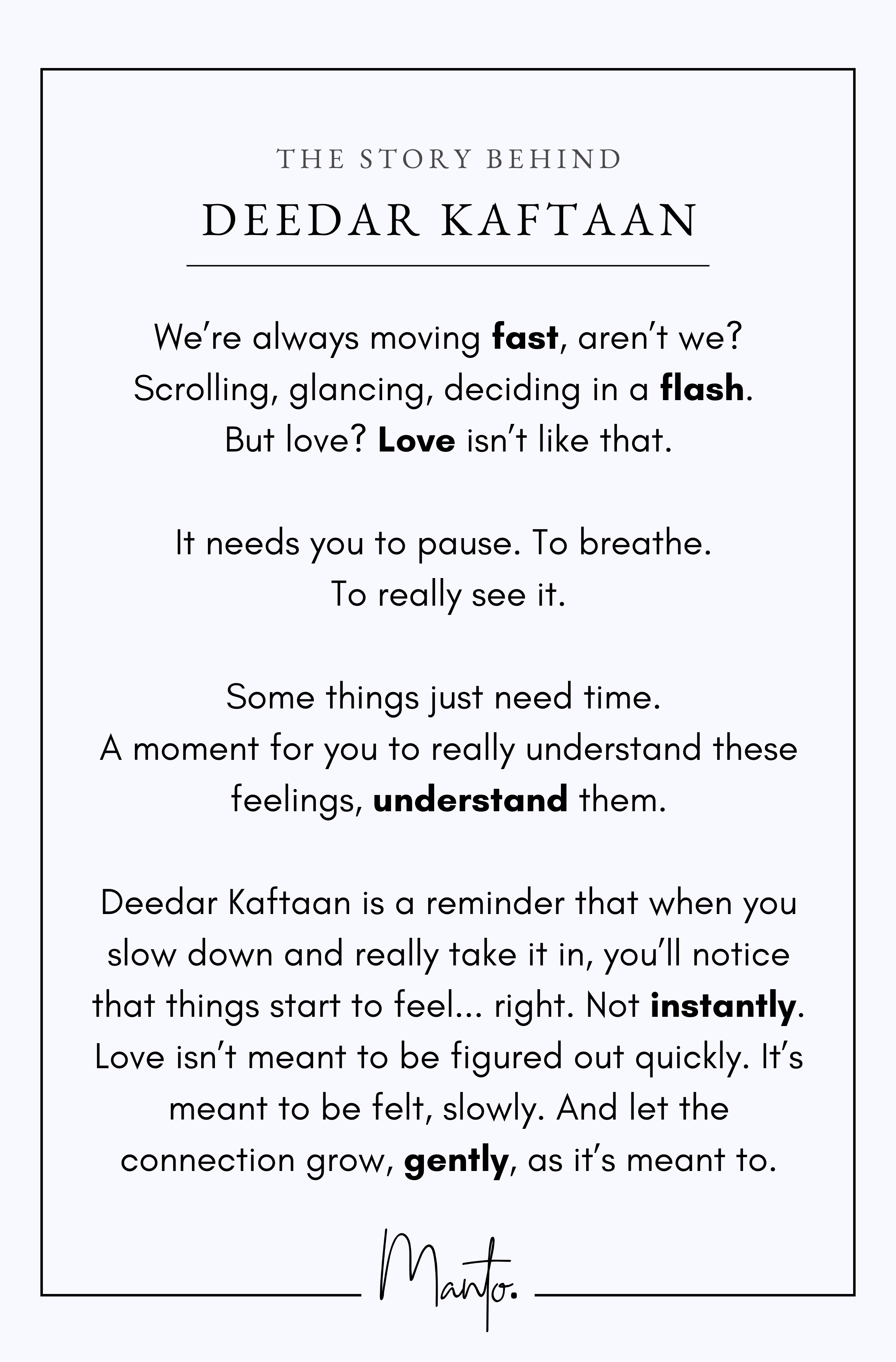 Deedar Kaftaan is a reminder that when you slow down and really take it in, you’ll notice that things start to feel... right. Not instantly. Love isn’t meant to be figured out quickly. It’s meant to be felt, slowly. And let the connection grow, gently, as it’s meant to.