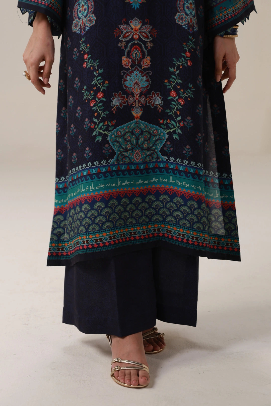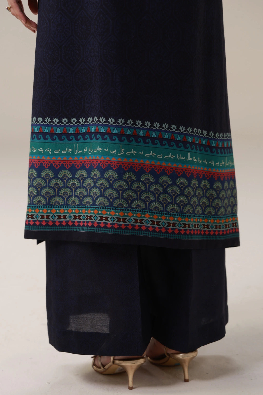 Kashmala Co-Ord Set is a 2-piece set. Featuring a loose, straight cut shirt paired with palazzo pants with the words of Mir Taqi Mir calligraphed throughout.