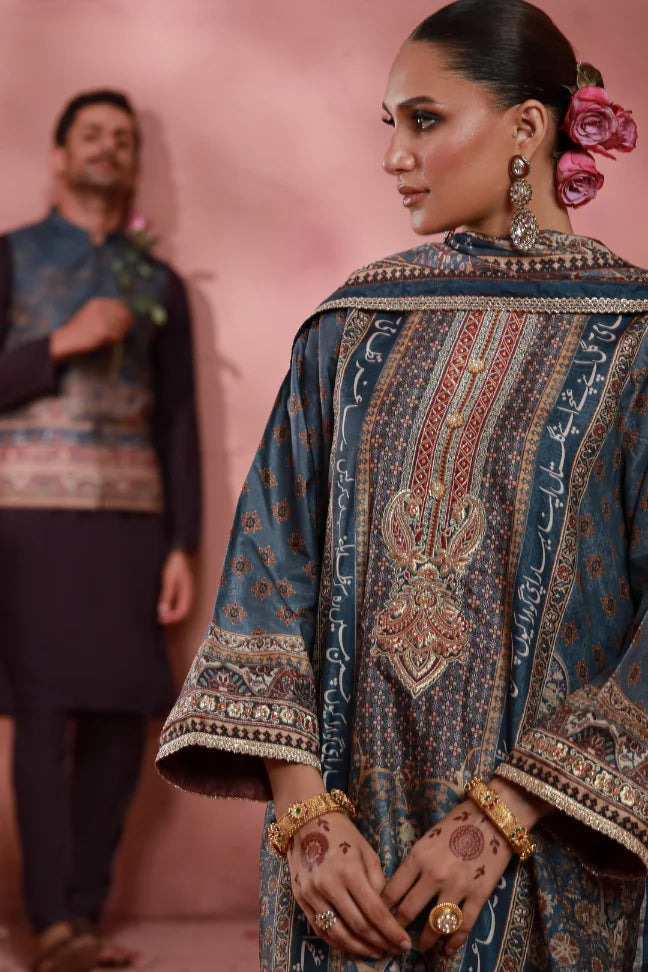 The Nazneen 3-Piece Set is crafted from premium raw silk and paired with straight pants. The dupatta, adorned with lace and tassel details, beautifully complements the outfit. Adding a touch of poetry, it features the timeless words of Sagar Nizami.