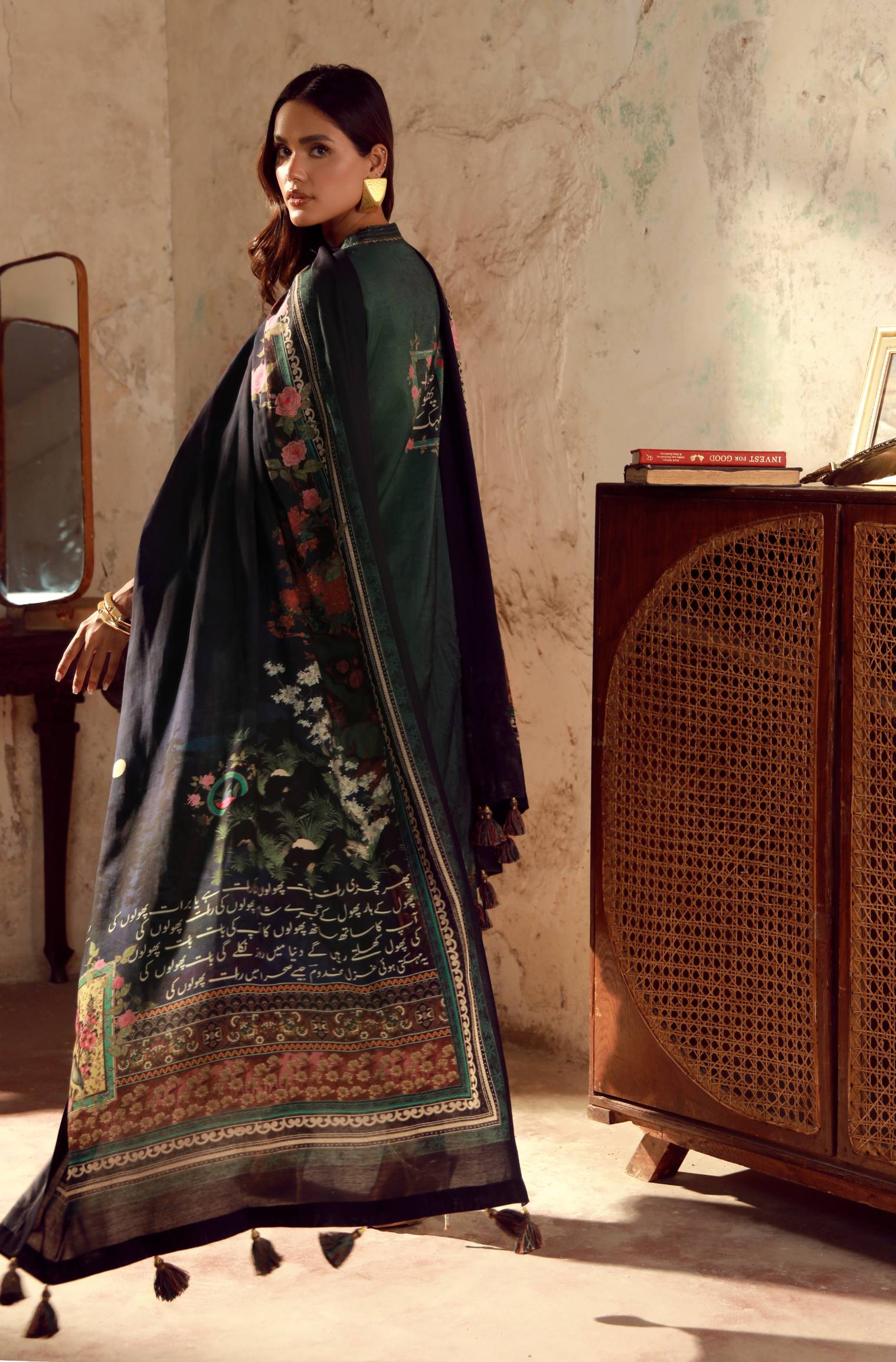 Premium Cotton Silk Odhni, featuring a floral print, tassels and poetry of Makhdoom Mohiuddin throughout.