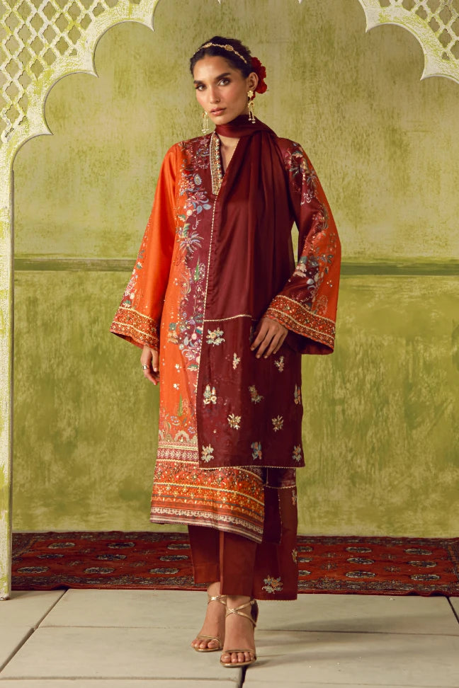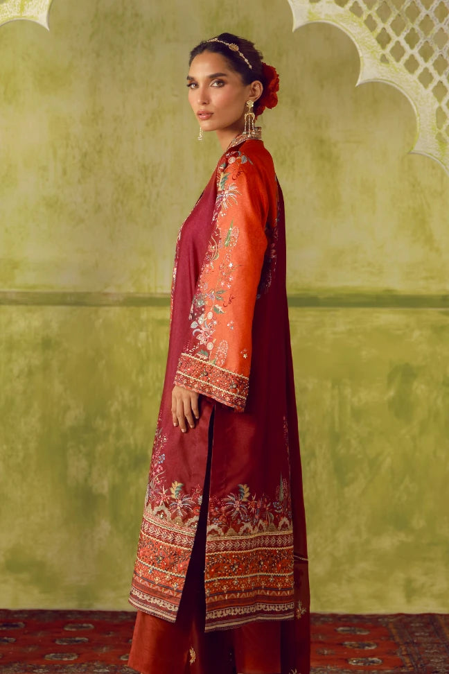 Premium raw silk 3-piece set, featuring a long shirt delicate embellishment through out the shirt, neckline & sleeves. Paired with straight pants and a silk dupatta with embroidery and lace on all sides.