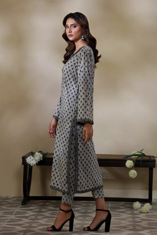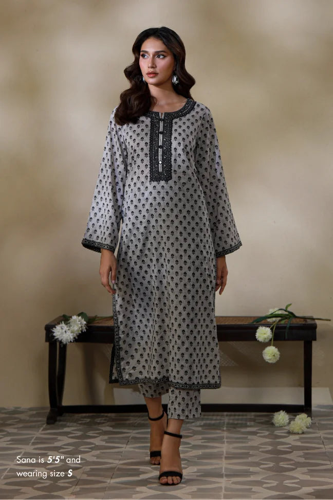 Printed 2-piece lawn co-ord set, featuring beautiful Urdu words calligraphed throughout the kurta, paired with straight pants!