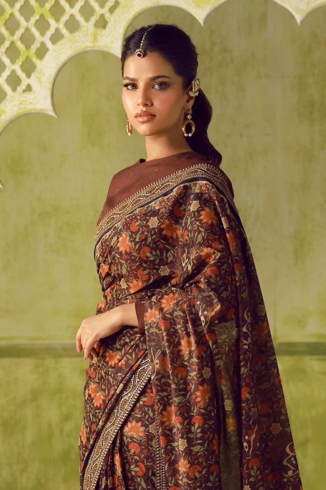 Khoobsurat is a cotton silk ready-to-wear saree with a Banarsi blouse and an embroidered border, featuring Urdu words calligraphed throughout. Available in 2 Colors.