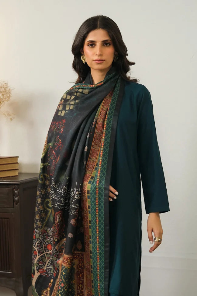 Dur-e-fishan Shawl, made using herringbone, is a double-sided shawl that features the words of Jigar Moradabadi calligraphed throughout.