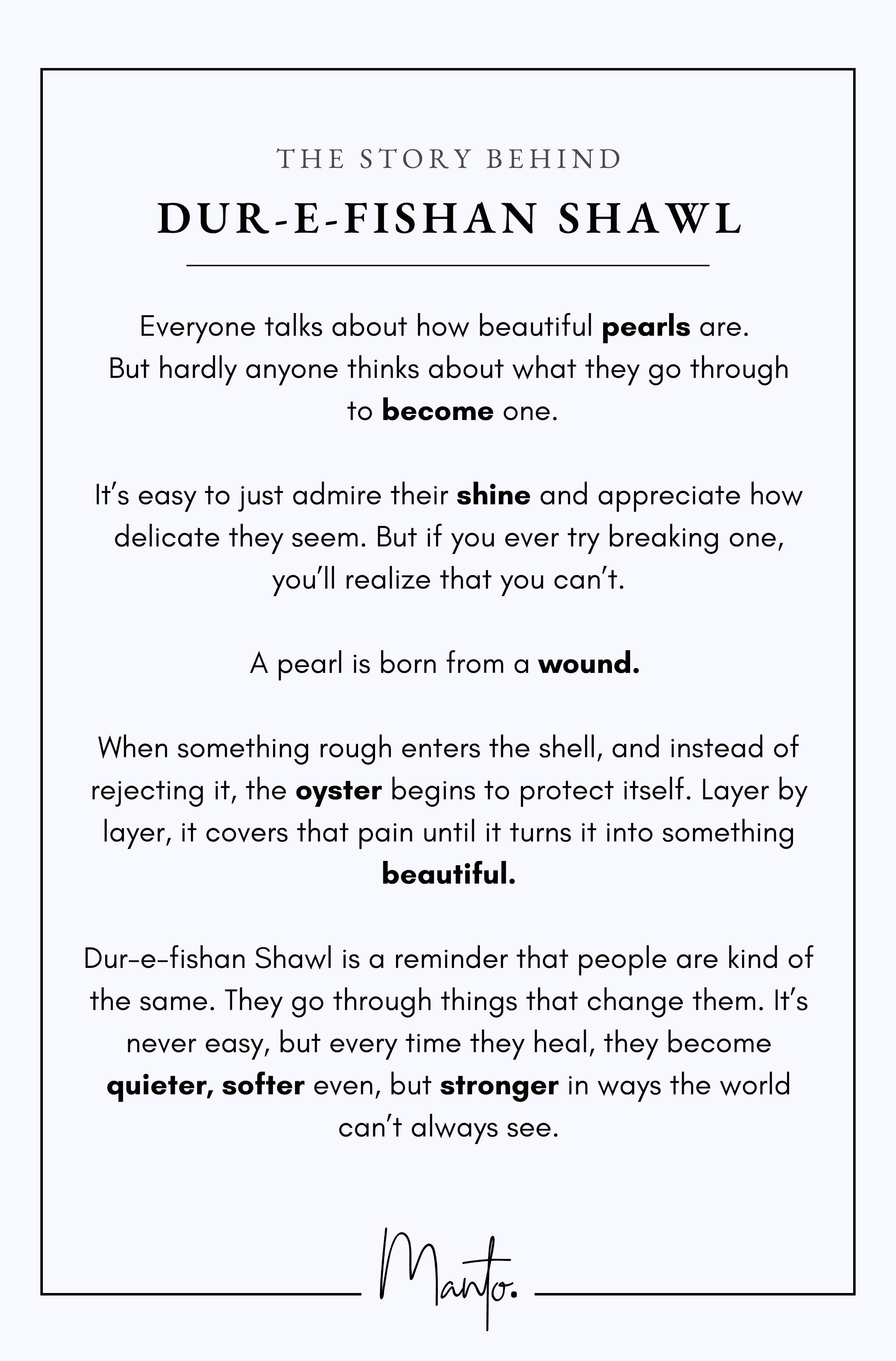 When something rough enters the shell, and instead of rejecting it, the oyster begins to protect itself. Layer by layer, it covers that pain until it turns it into something beautiful.