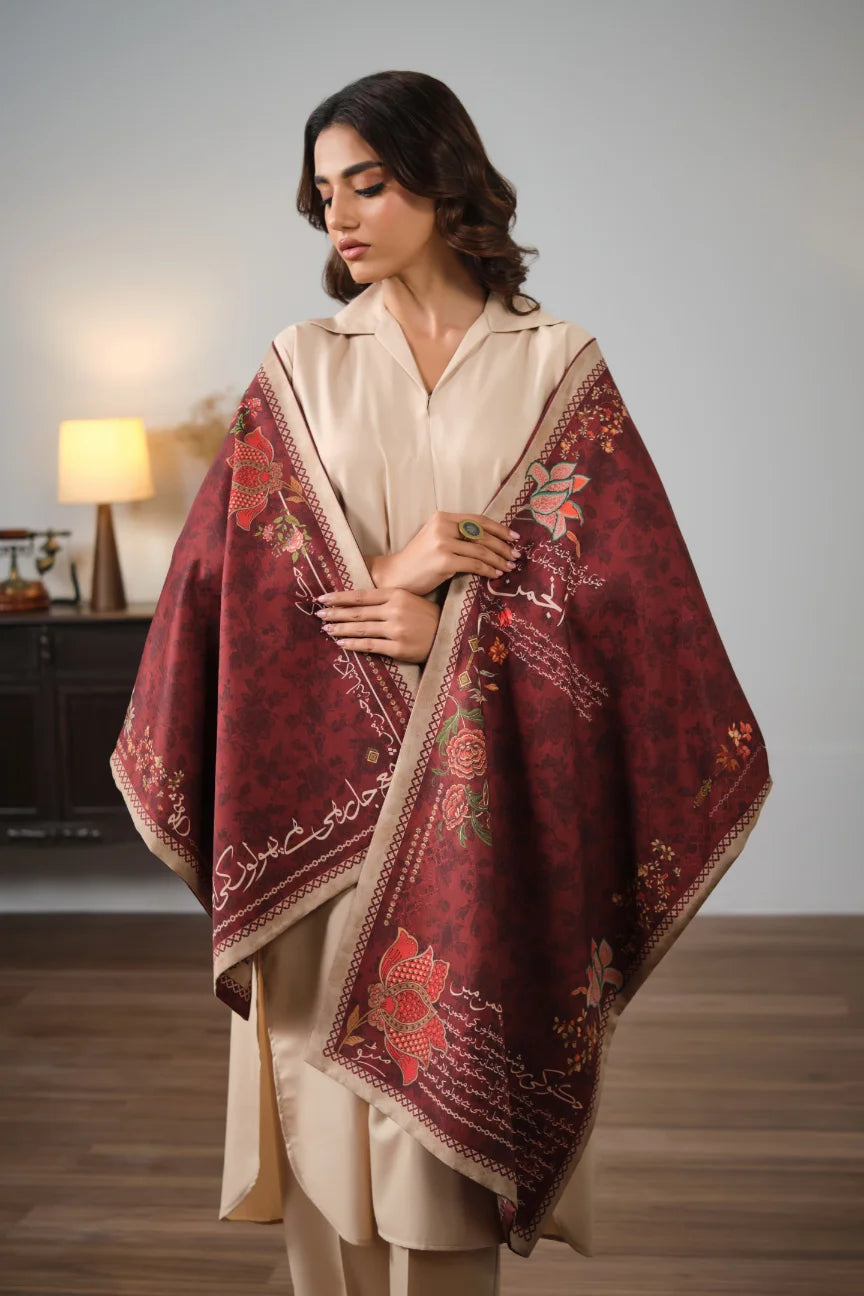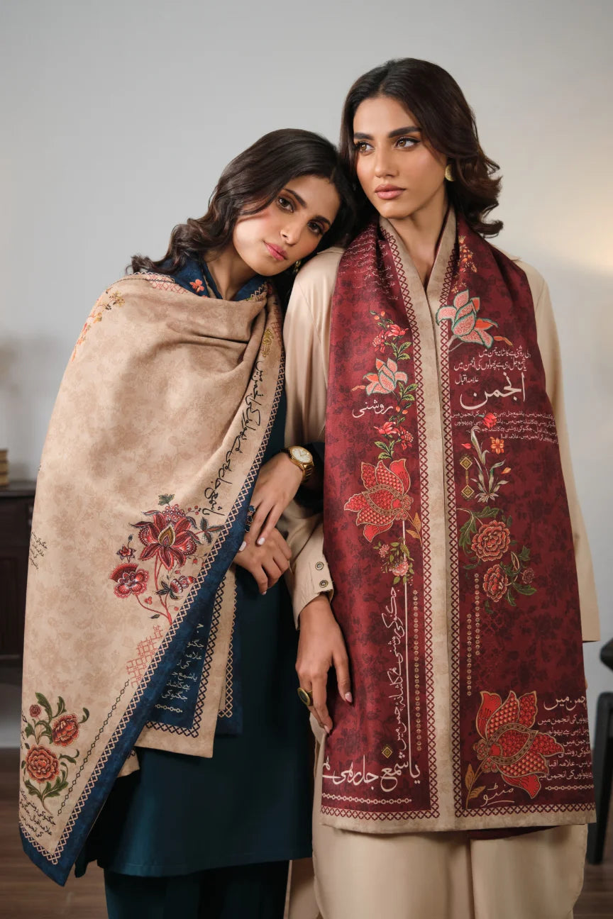 Double-sided pashmina Stole, featuring the words of Allama Iqbal throughout. Making it the accessory for layering this winter season!