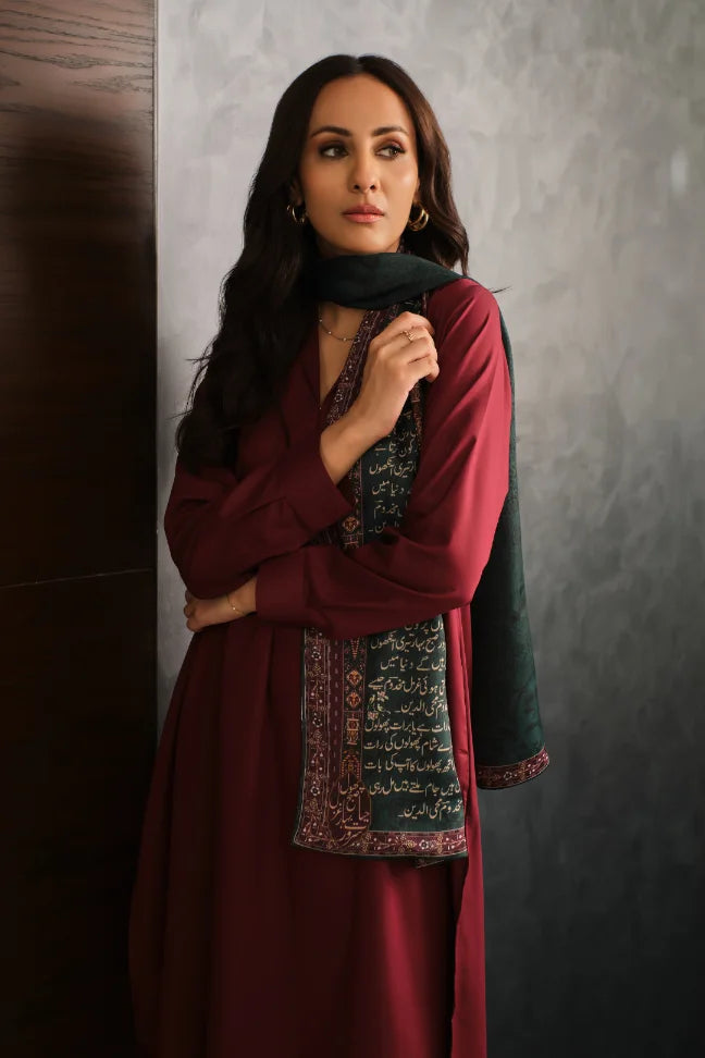 Double-sided crinkle silk stole, featuring Urdu calligraphy of poetry by Sahir Ludhianvi. Available in 2 colors.