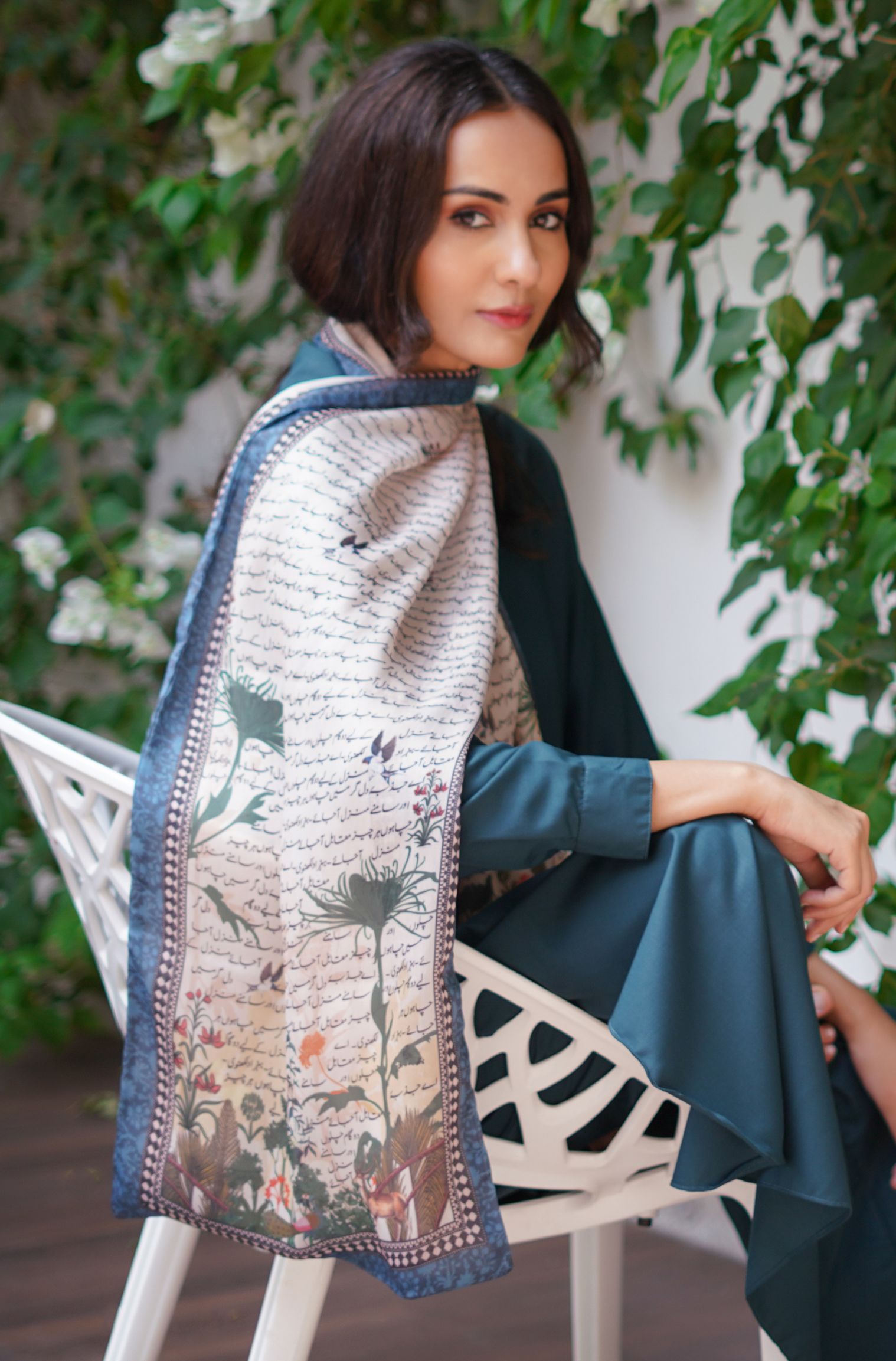 Double-Side Printed Crinkle Silk Stole Featuring Urdu Calligraphy of Words by Behzad Lakhnavi. Available in 3 Colors!