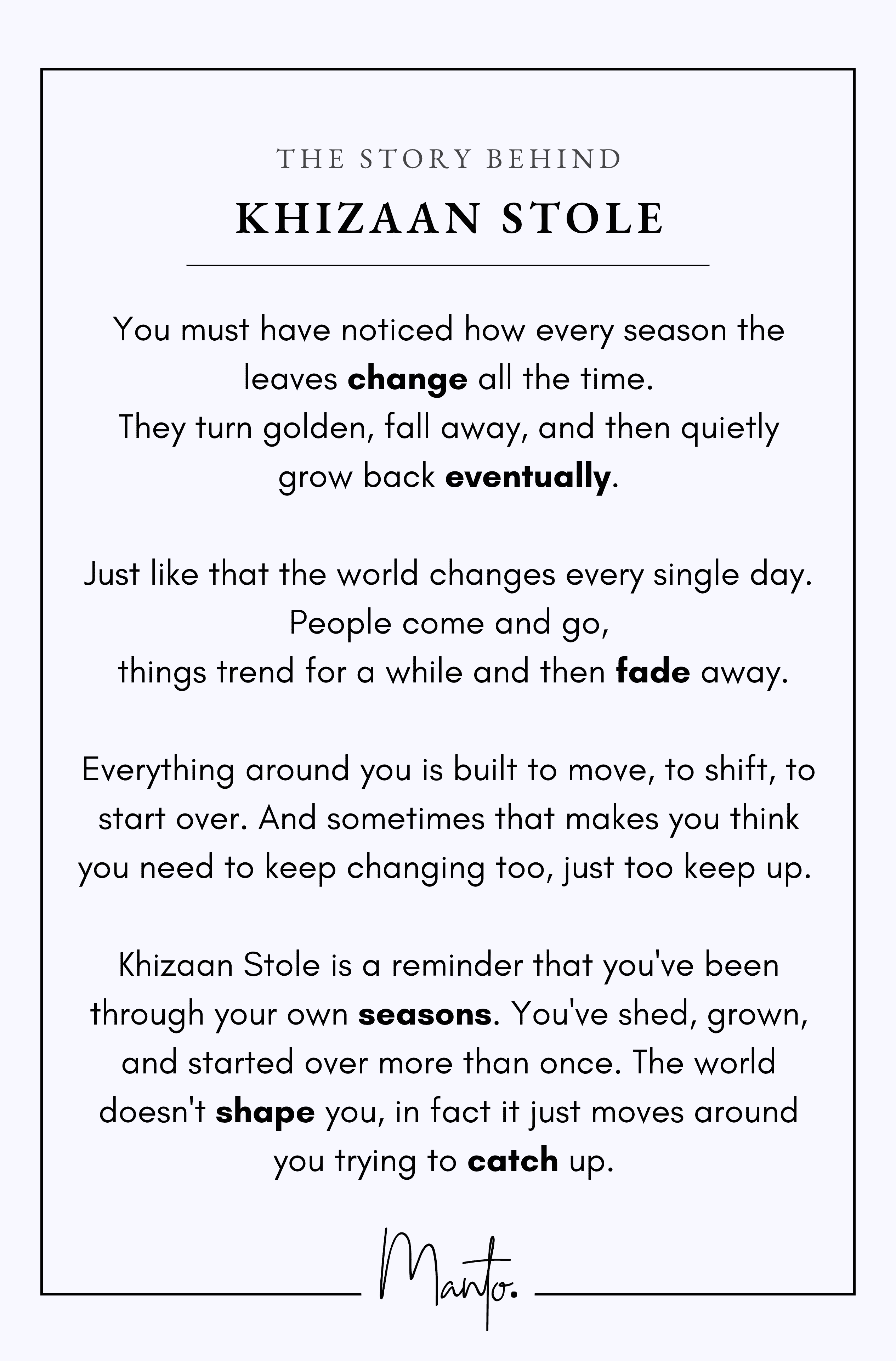 Khizaan Stole is a reminder that you've been through your own seasons. You've shed, grown, and started over more than once. The world doesn't shape you, in fact it just moves around you trying to catch up.