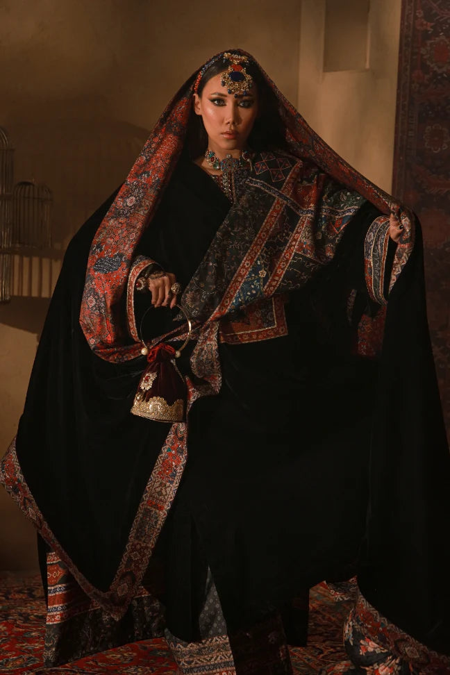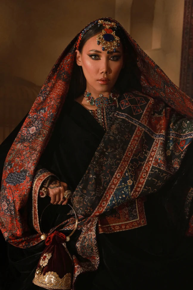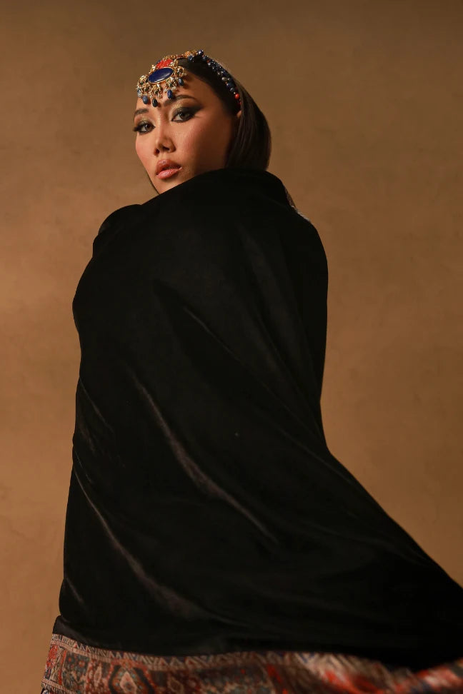 Khumar Shawl, is a reversible Shawl. Made with premium Velvet, the back of this shawl features a printed Raw Silk design. Allowing you to wear it either way and make a statement!